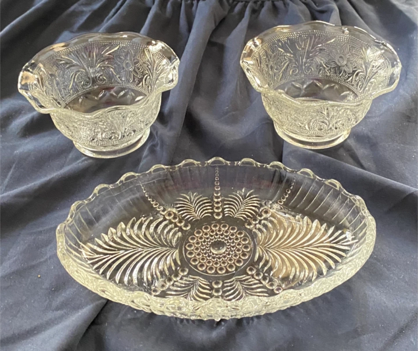 Selling beautiful vintage Anchor Hocking glass serving set! It includes two small bowls and one oval serving dish. The glass has a lovely embossed pattern. Perfect for adding a touch of elegance to your table!