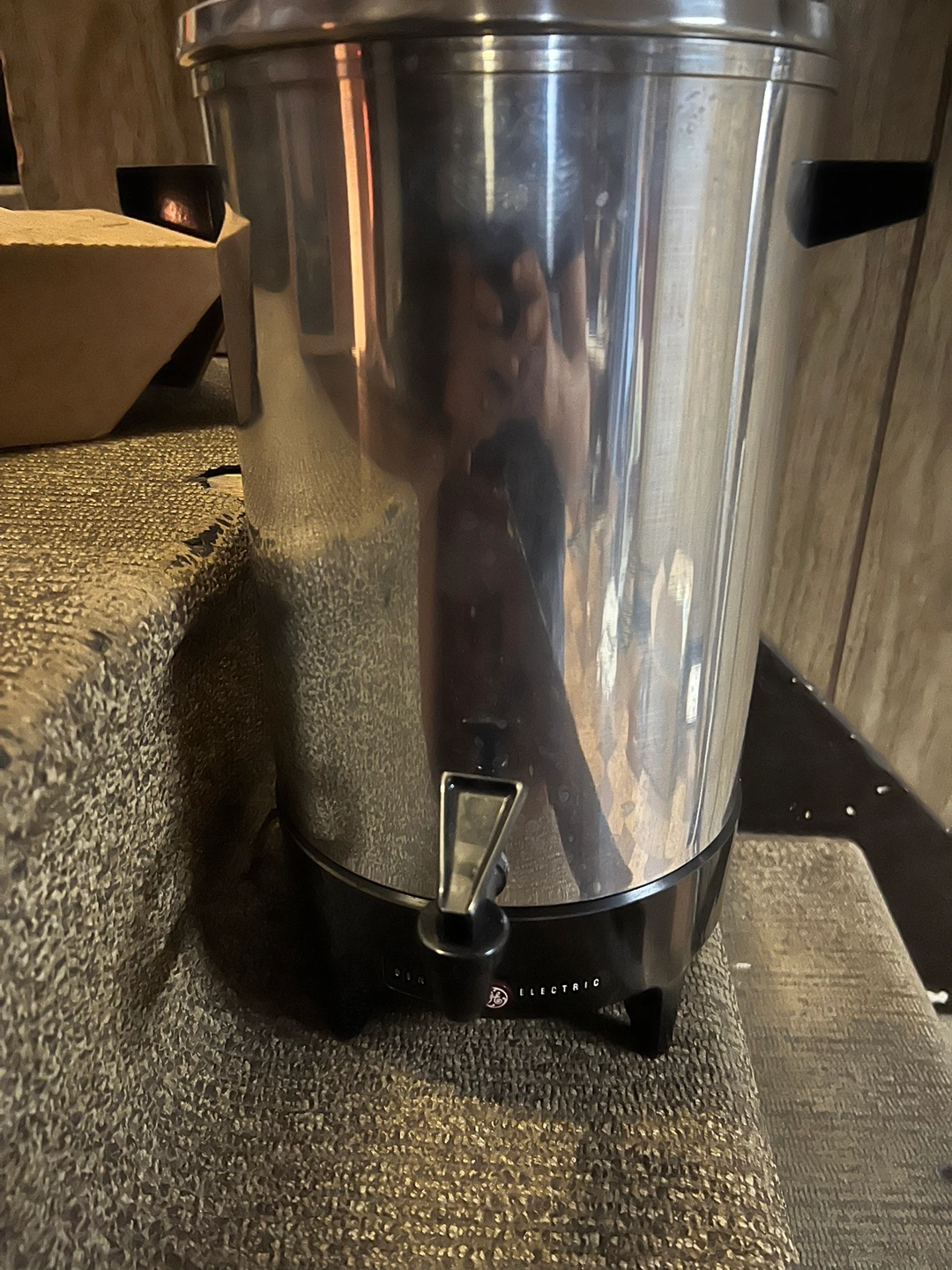 10Silver coffee percolator with black base and handle. Has a lever on the front for dispensing coffee. A small silver plate on the base reads "Electric".