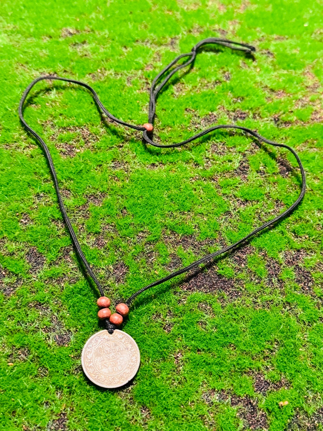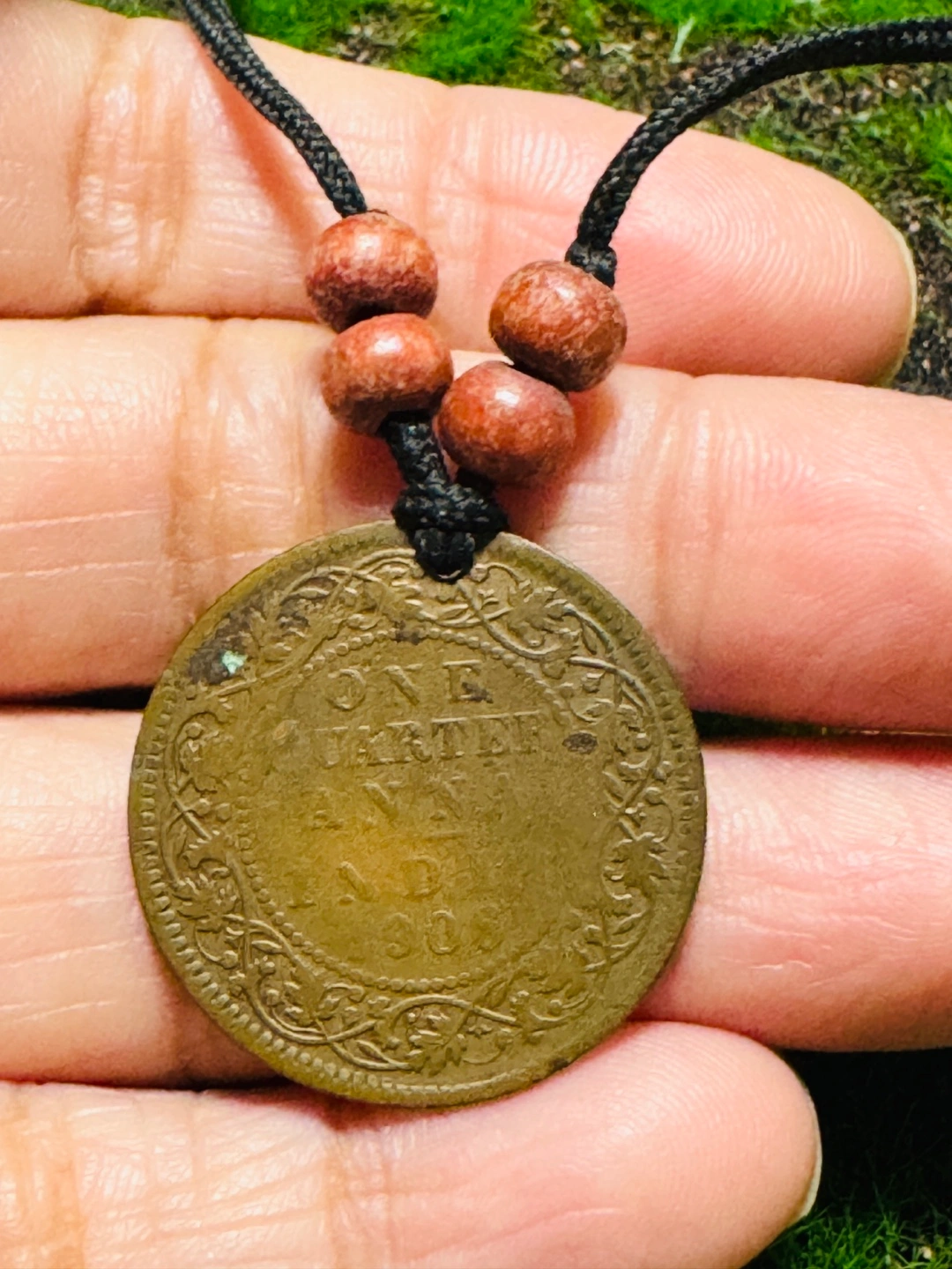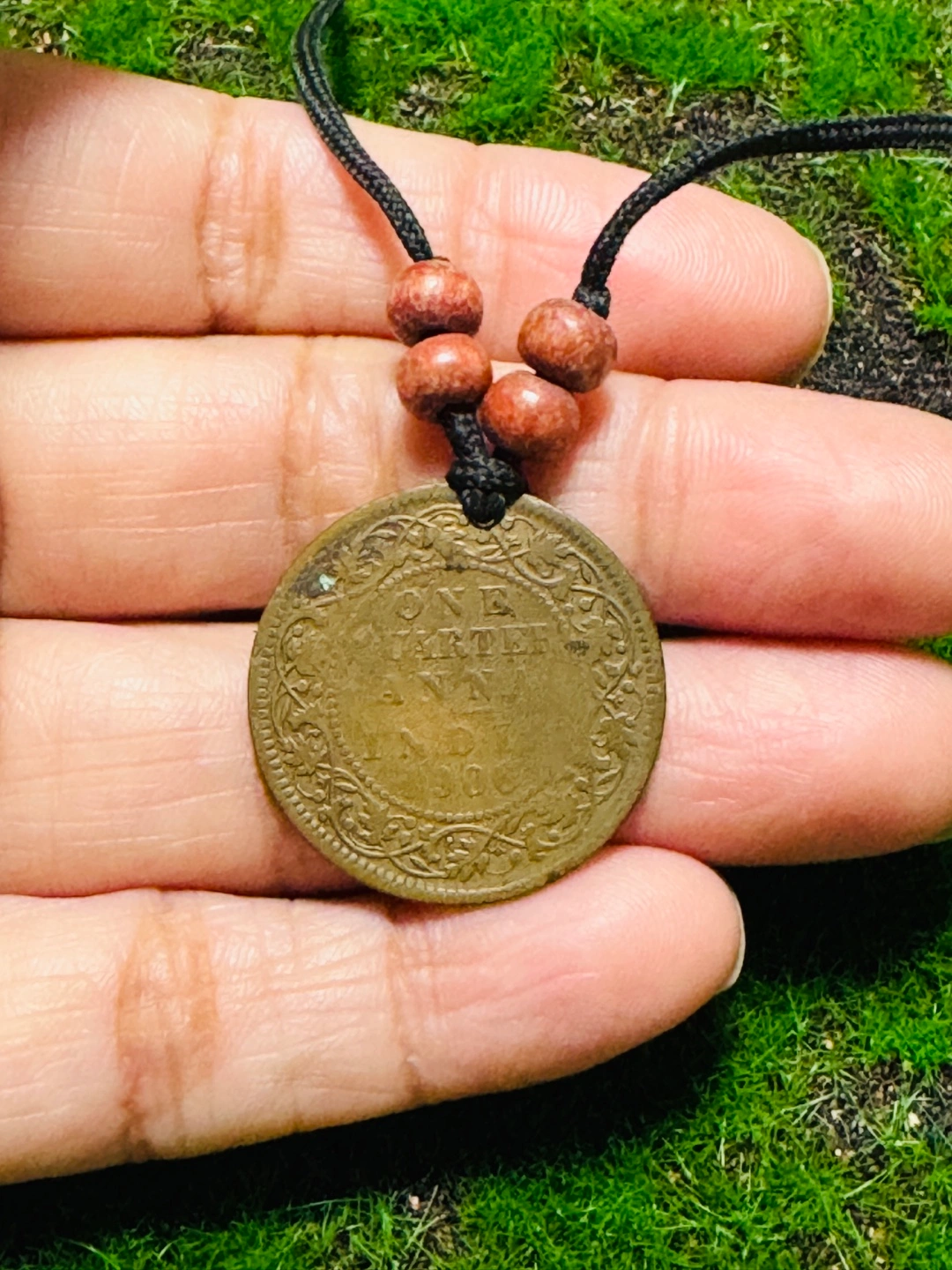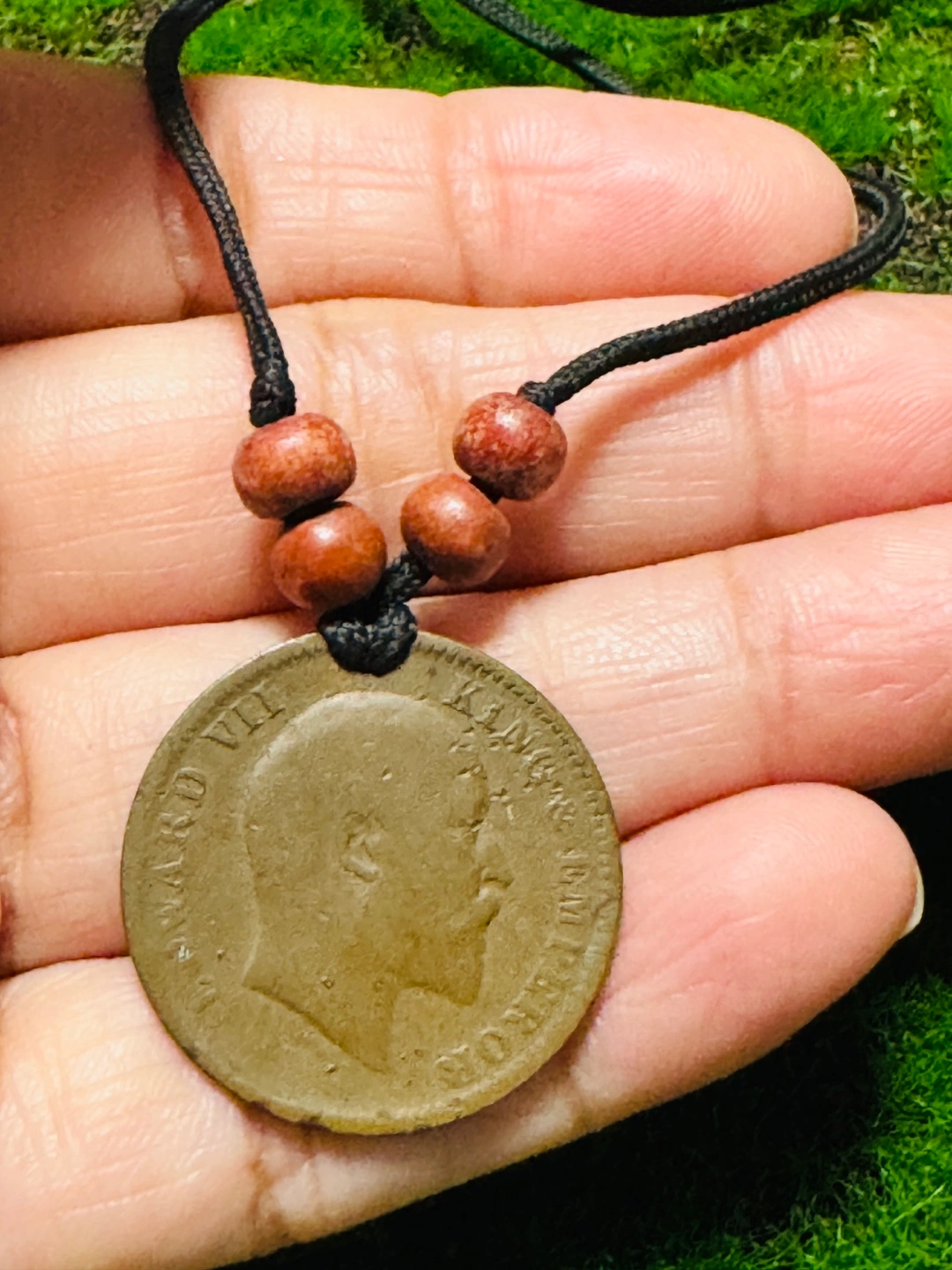 I'm selling a vintage coin pendant necklace. It features an old coin with a portrait and the words "EDWARD VII KING & EMPEROR". The reverse side says "ONE QUARTER ANNA INDIA 1908". The pendant is strung on a black cord with small wooden beads. It's a unique piece!