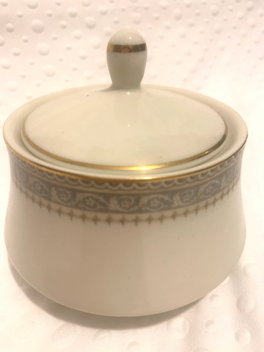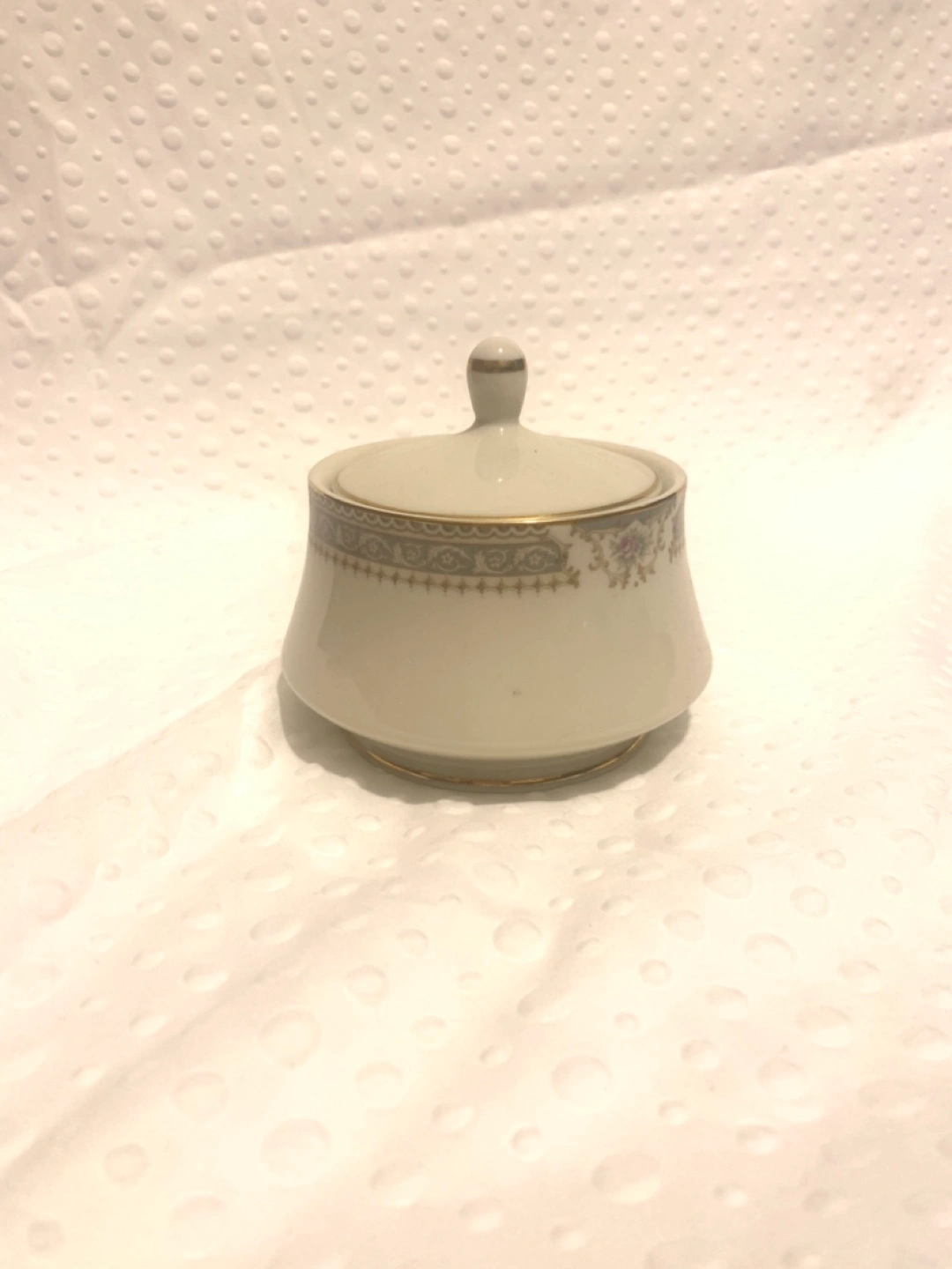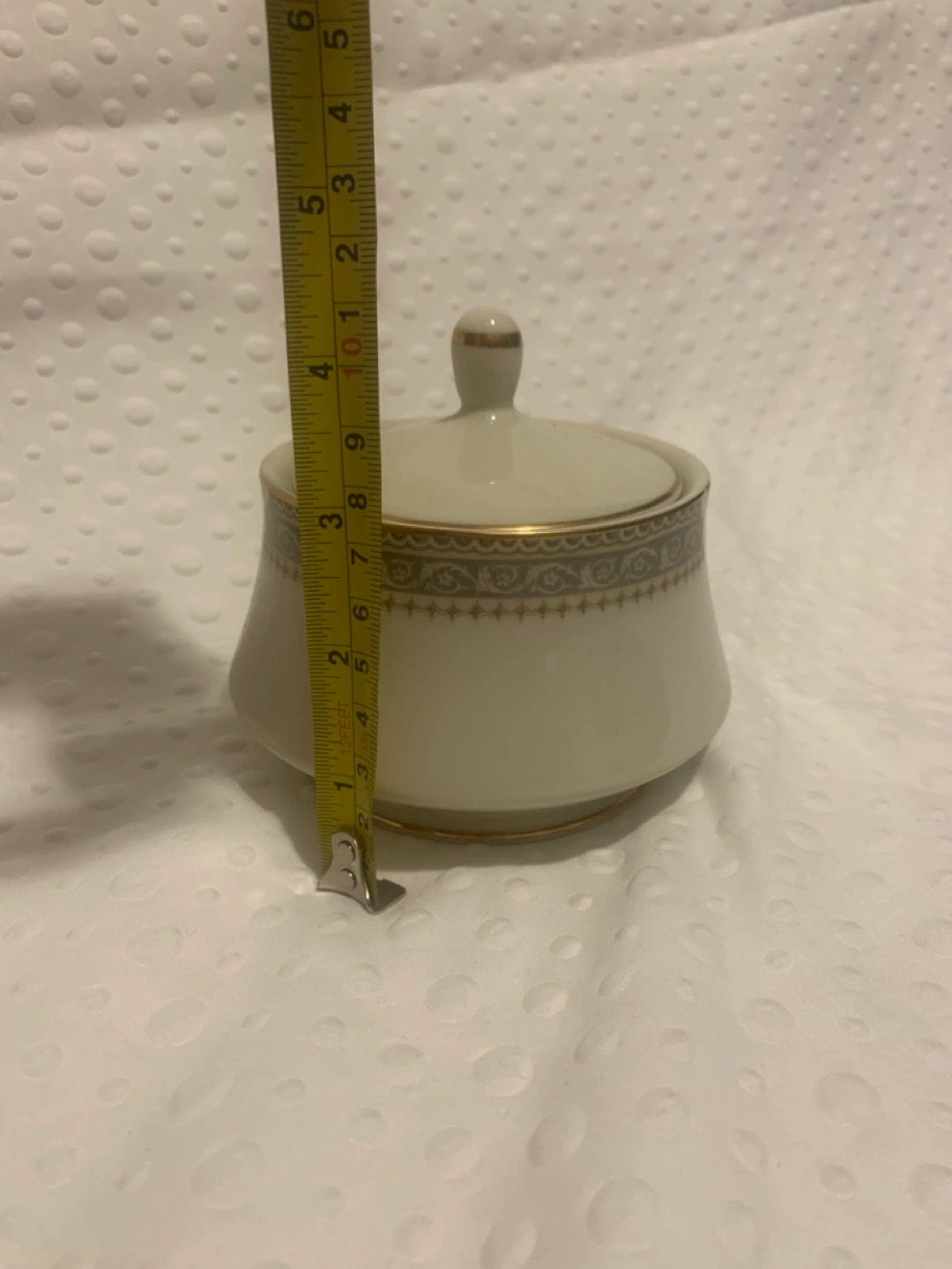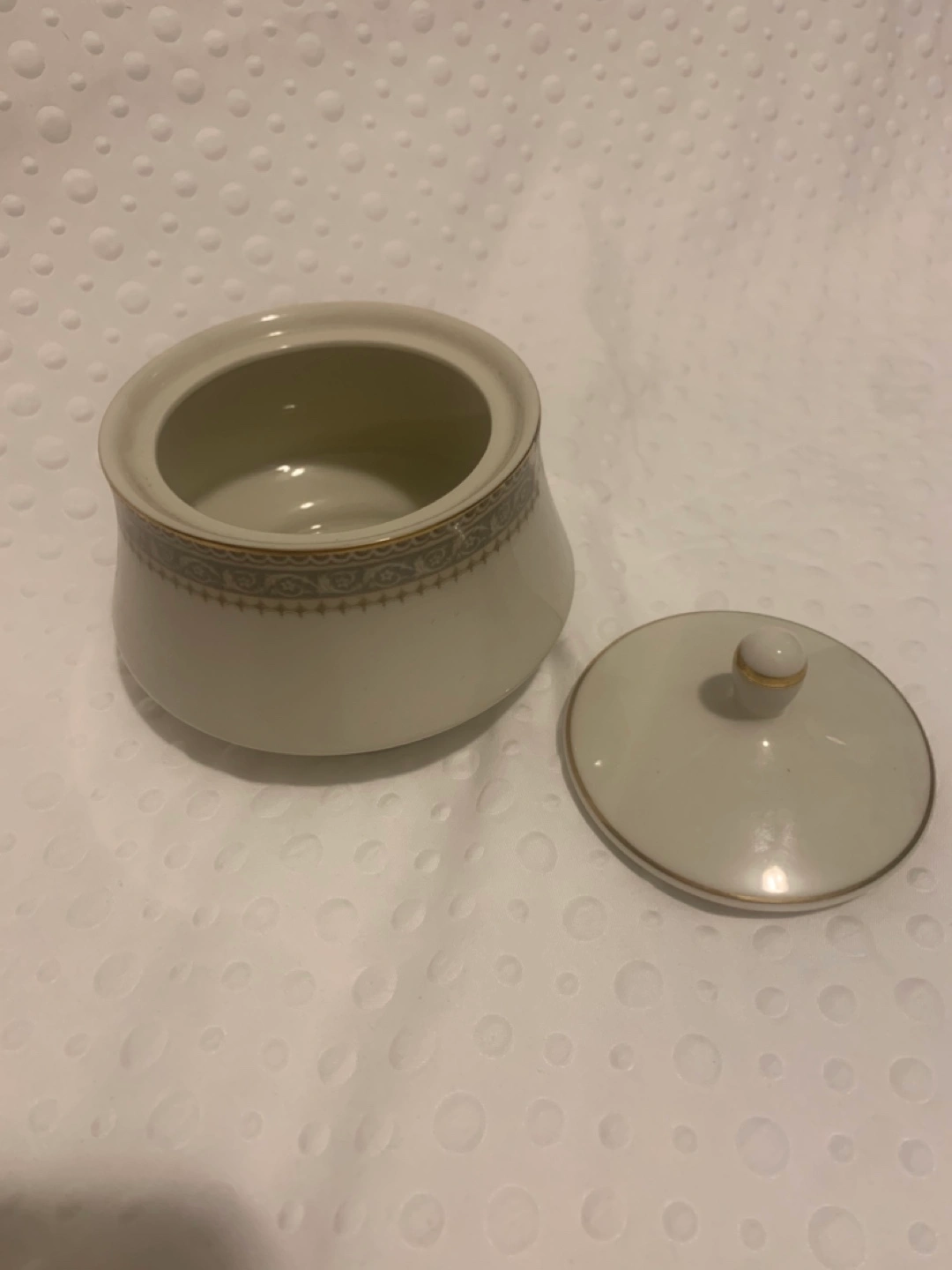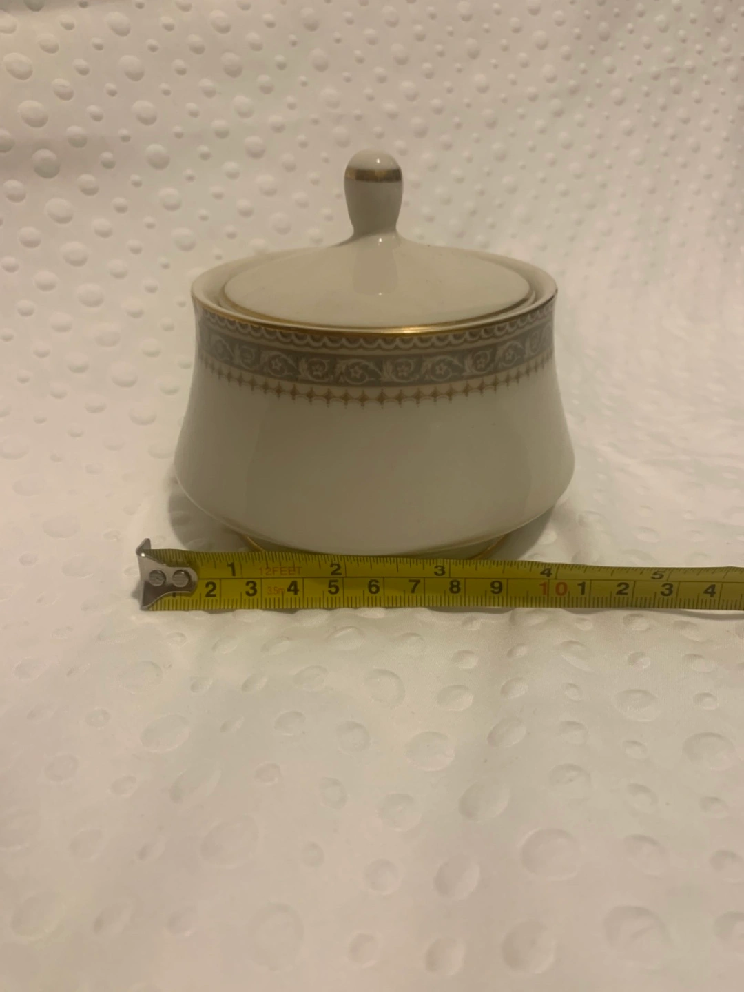 68Selling a lovely vintage cream-colored sugar bowl with a lid. It has a delicate gold trim and a decorative pattern around the top. It measures approximately 4 inches in height and 4 inches in diameter. Perfect for adding a touch of elegance to your table!