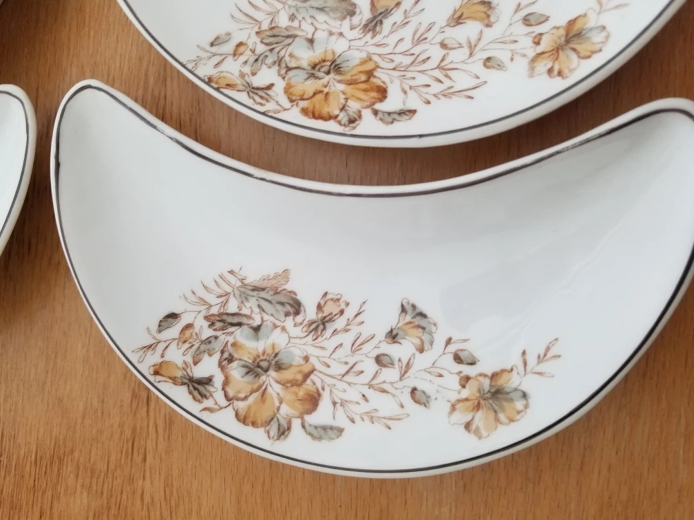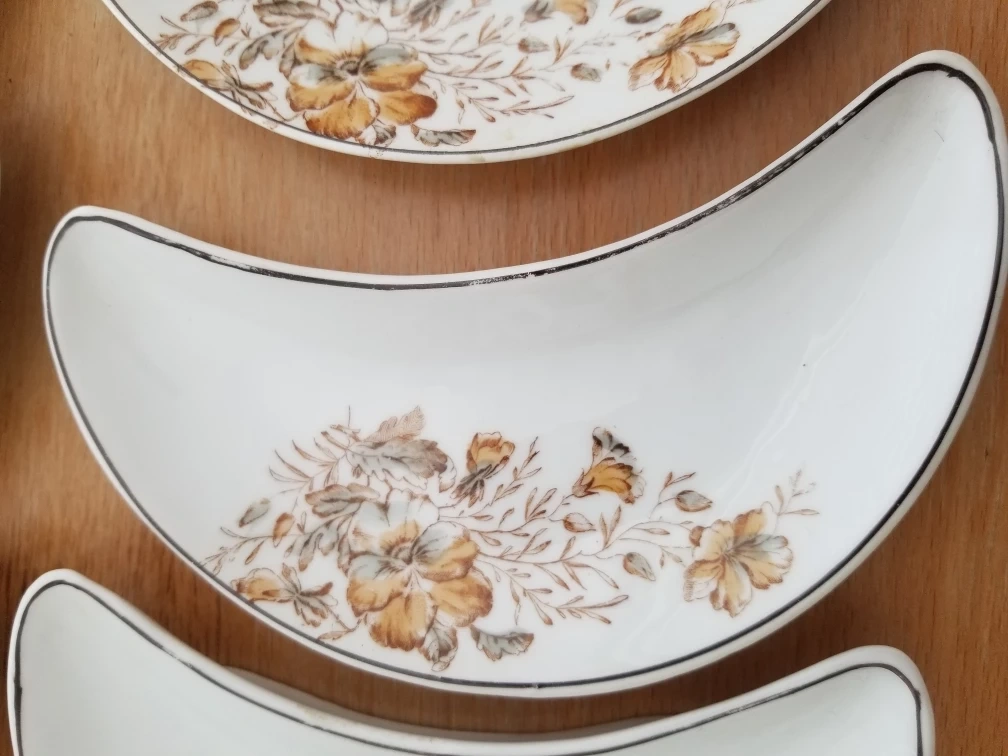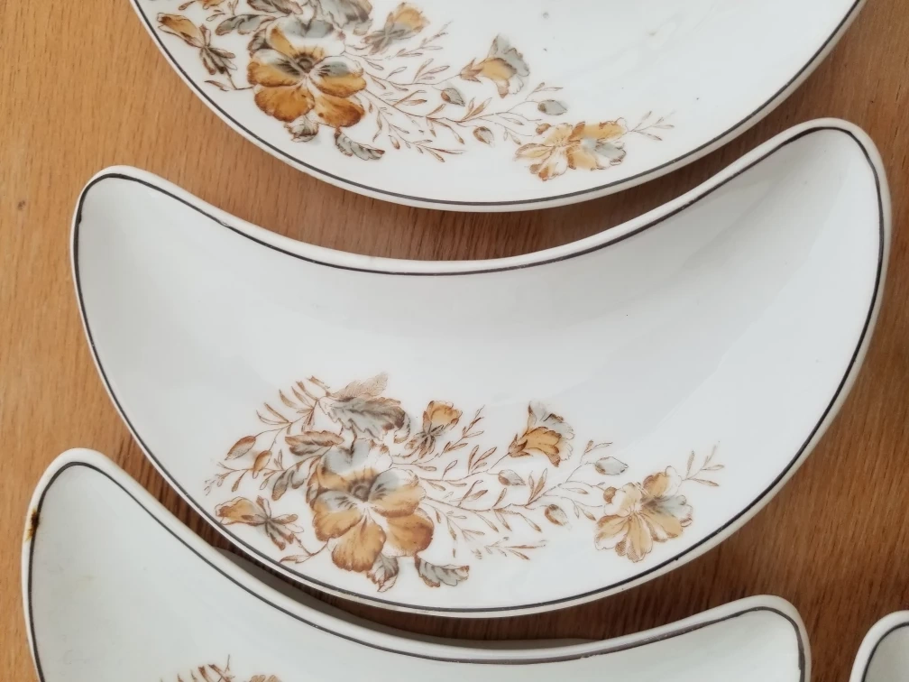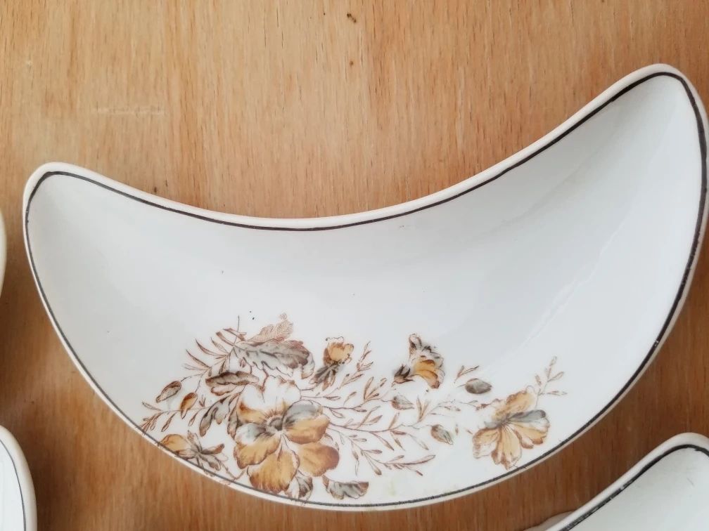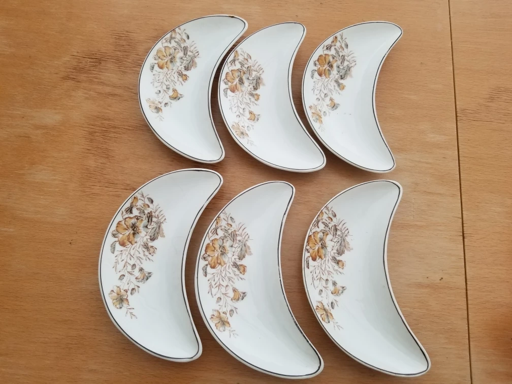 70Set of 6 vintage crescent shaped plates with a yellow floral pattern. Gold trim. These are bone dishes, used to hold chicken bones during your meal.