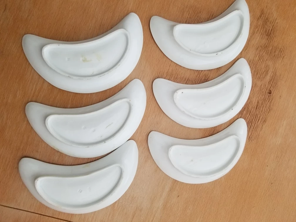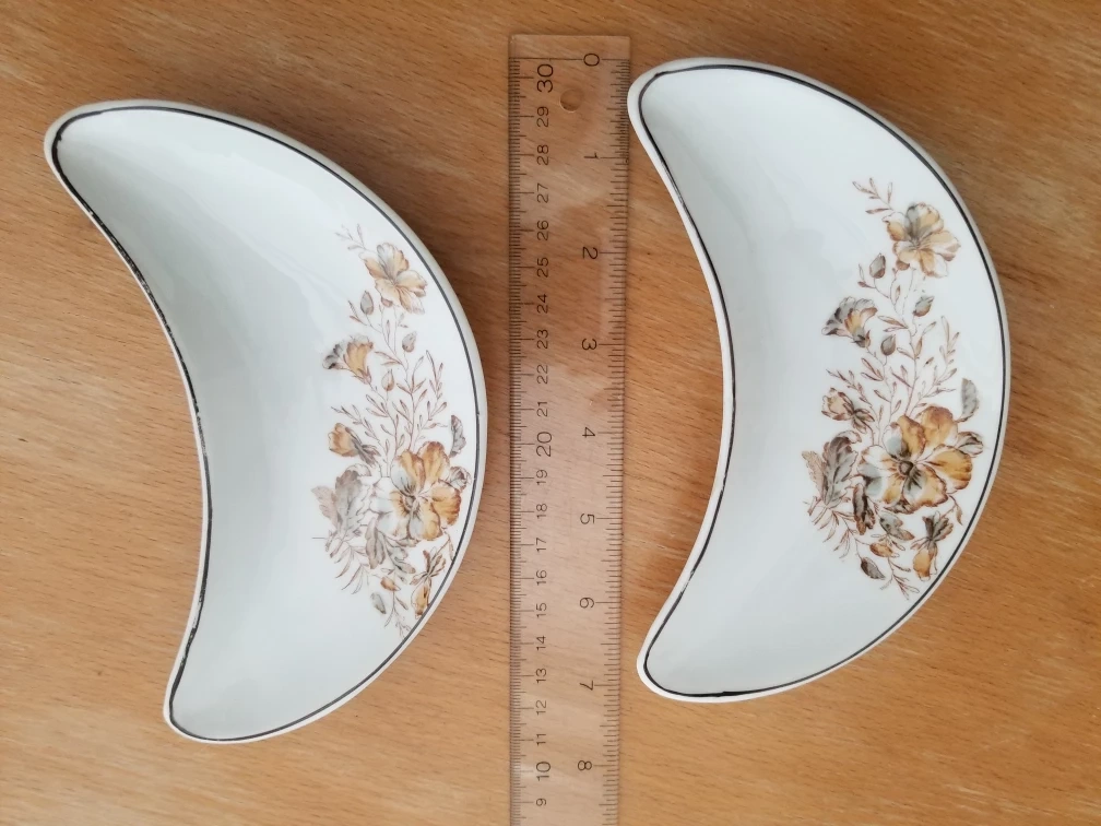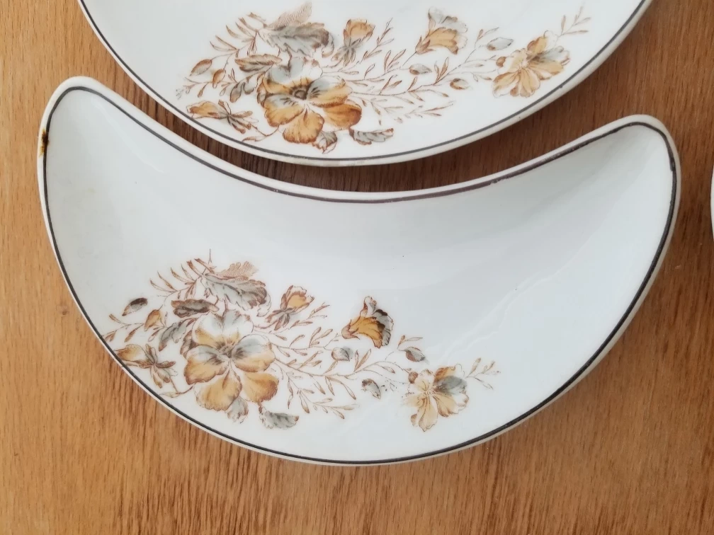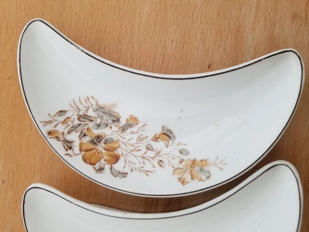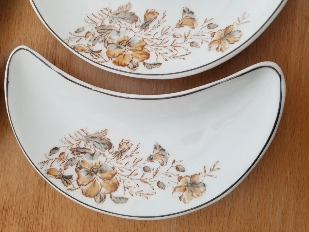 70Set of 6 vintage crescent shaped plates with a yellow floral pattern. Gold trim. These are bone dishes, used to hold chicken bones during your meal.