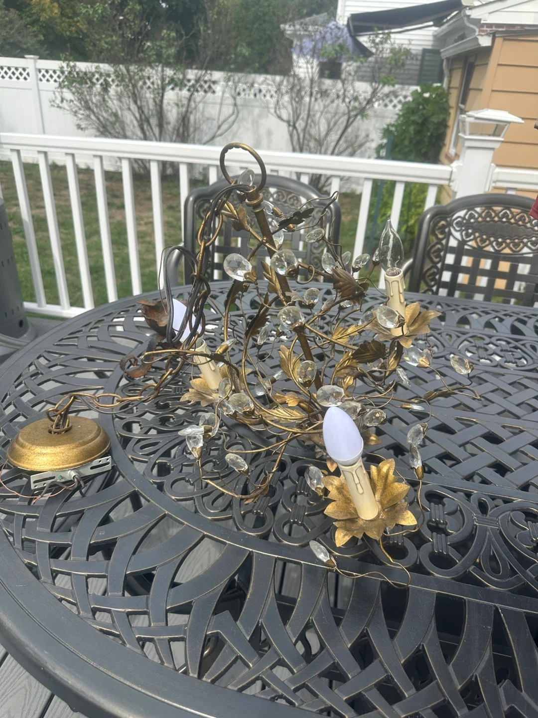 0Selling a vintage-style chandelier with crystal accents. It features a gold-tone finish and a leafy design. It would make a beautiful addition to any room!