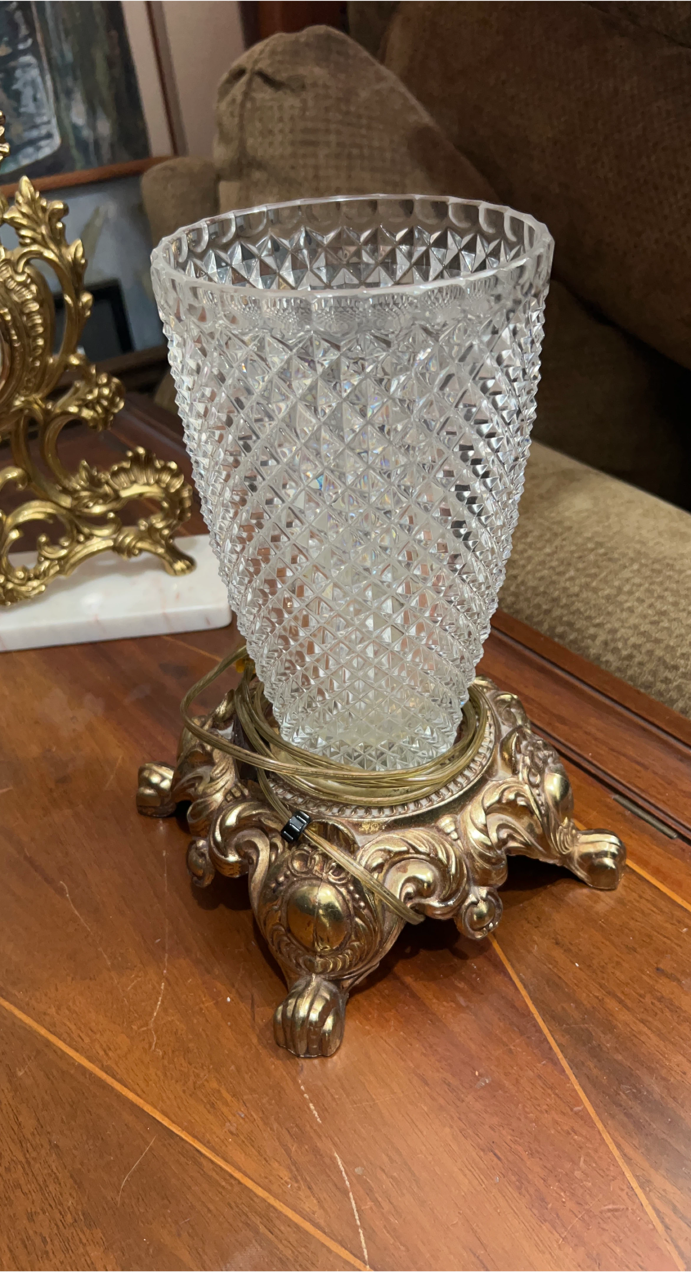 This is a beautiful vintage lamp featuring a crystal vase-shaped top and an ornate gold-colored base. It would add a touch of elegance to any room!