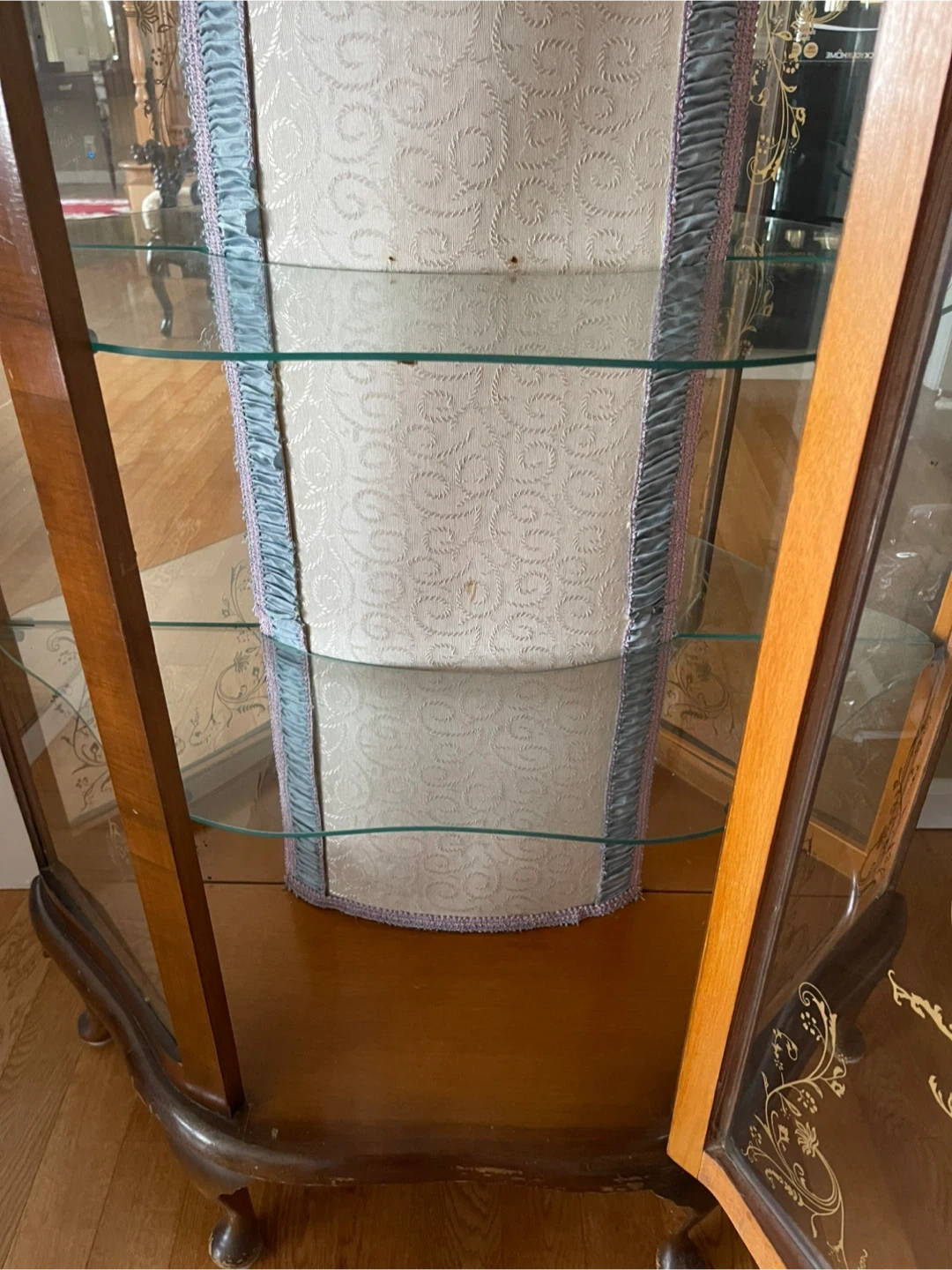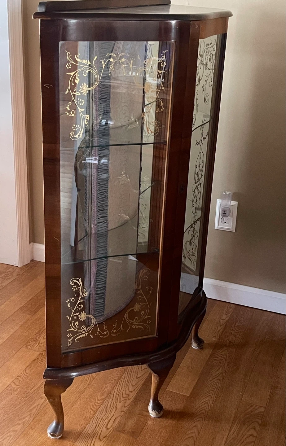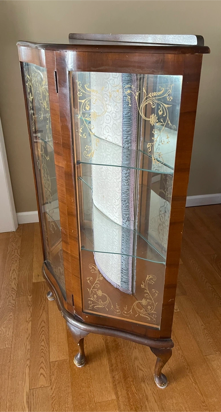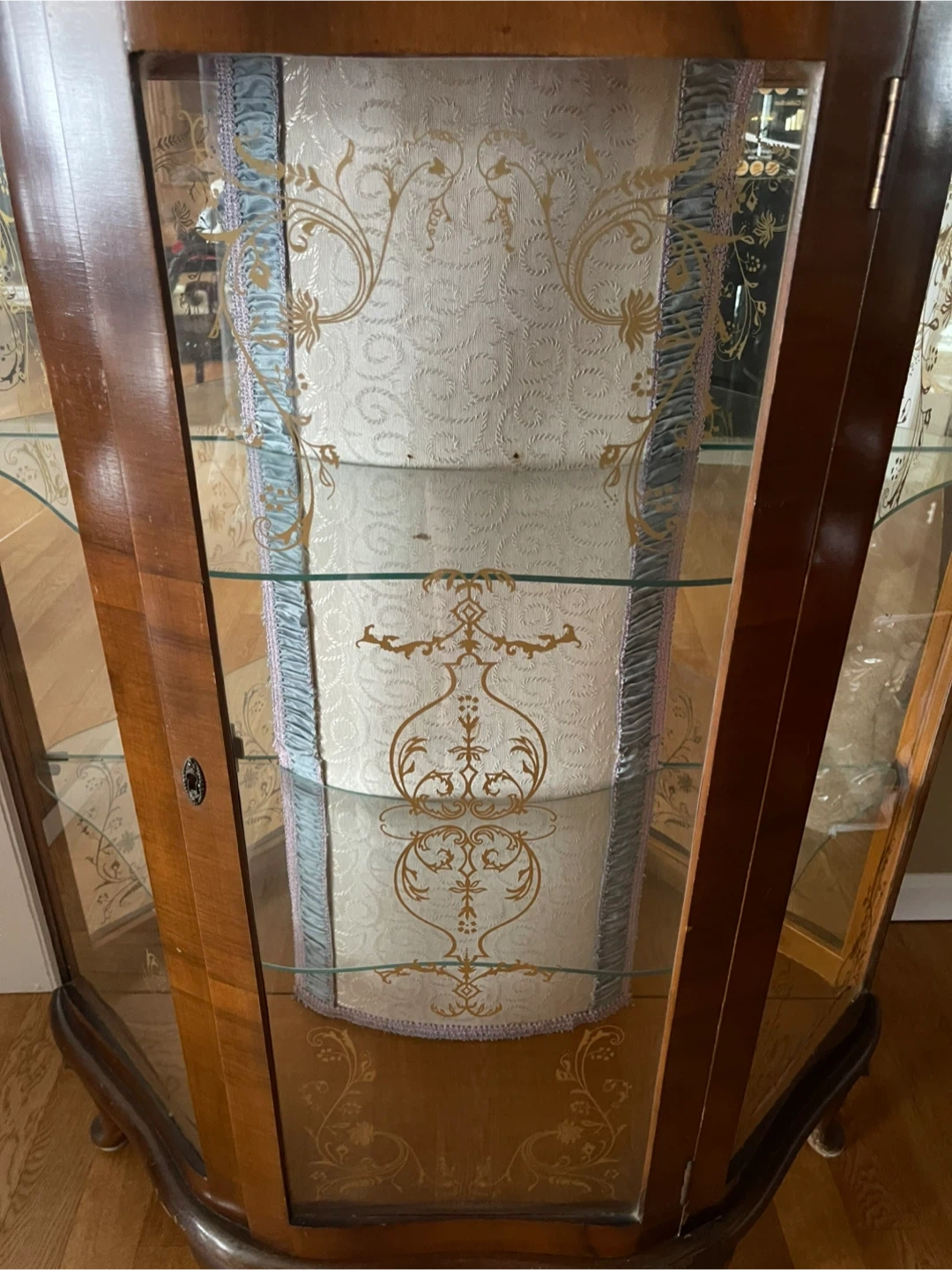 10Selling a vintage curio cabinet with glass shelves and decorative gold accents on the glass. It features a dark wood finish and unique curved design. Perfect for displaying collectibles or adding a touch of vintage charm to your home!