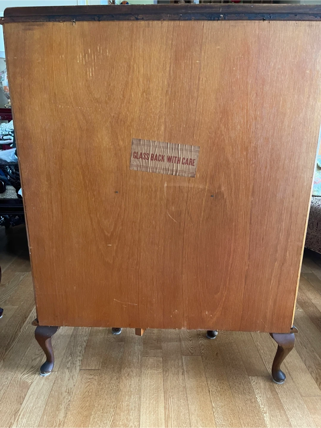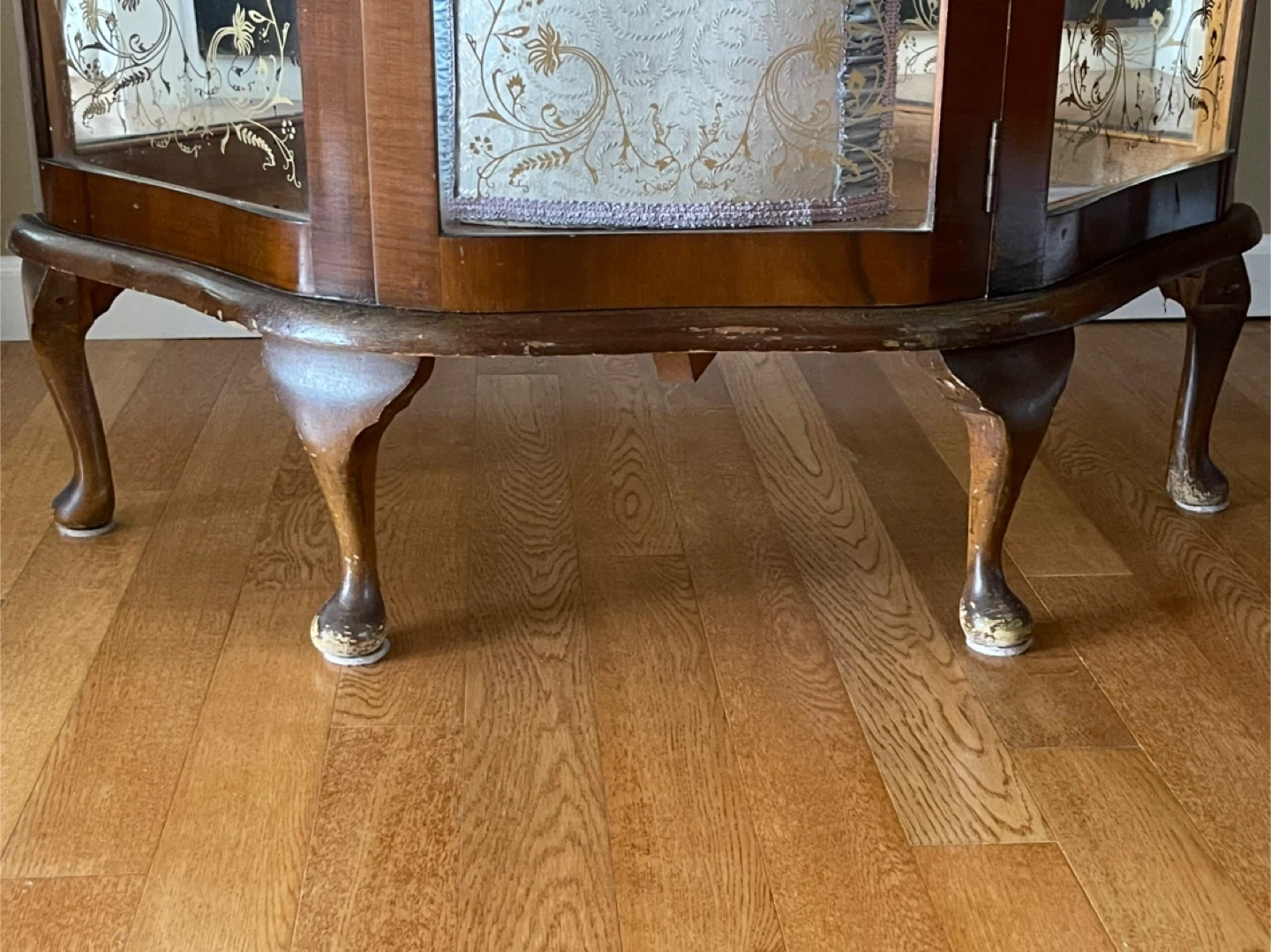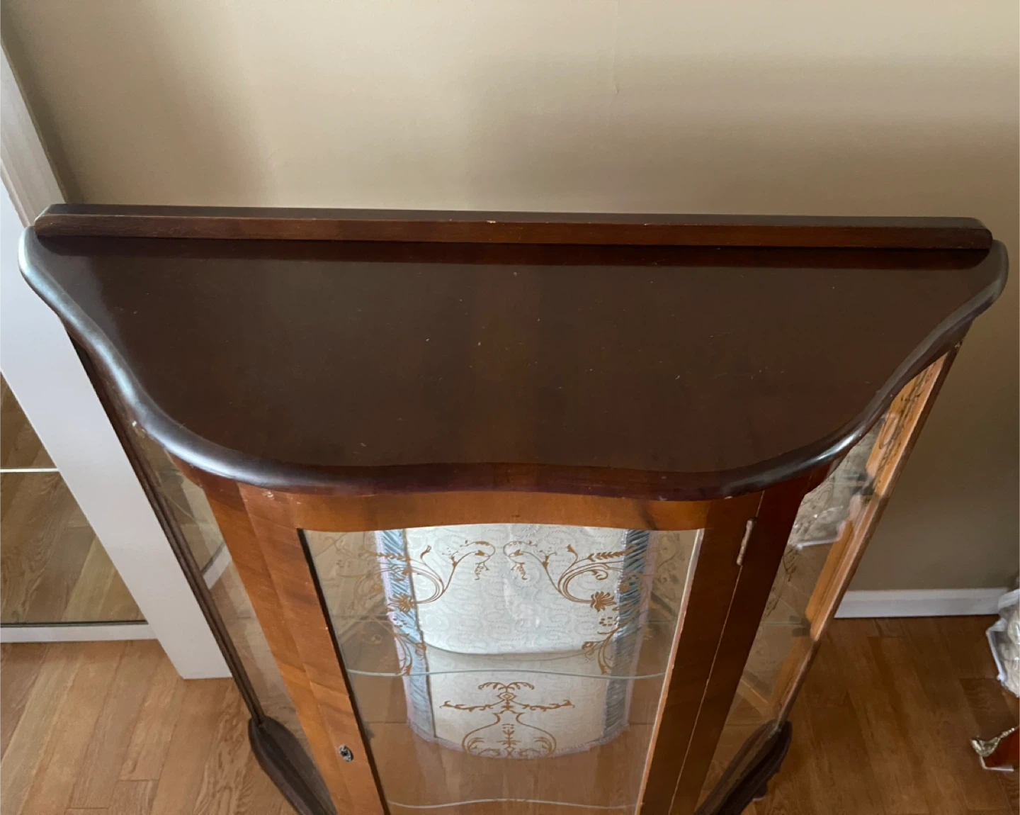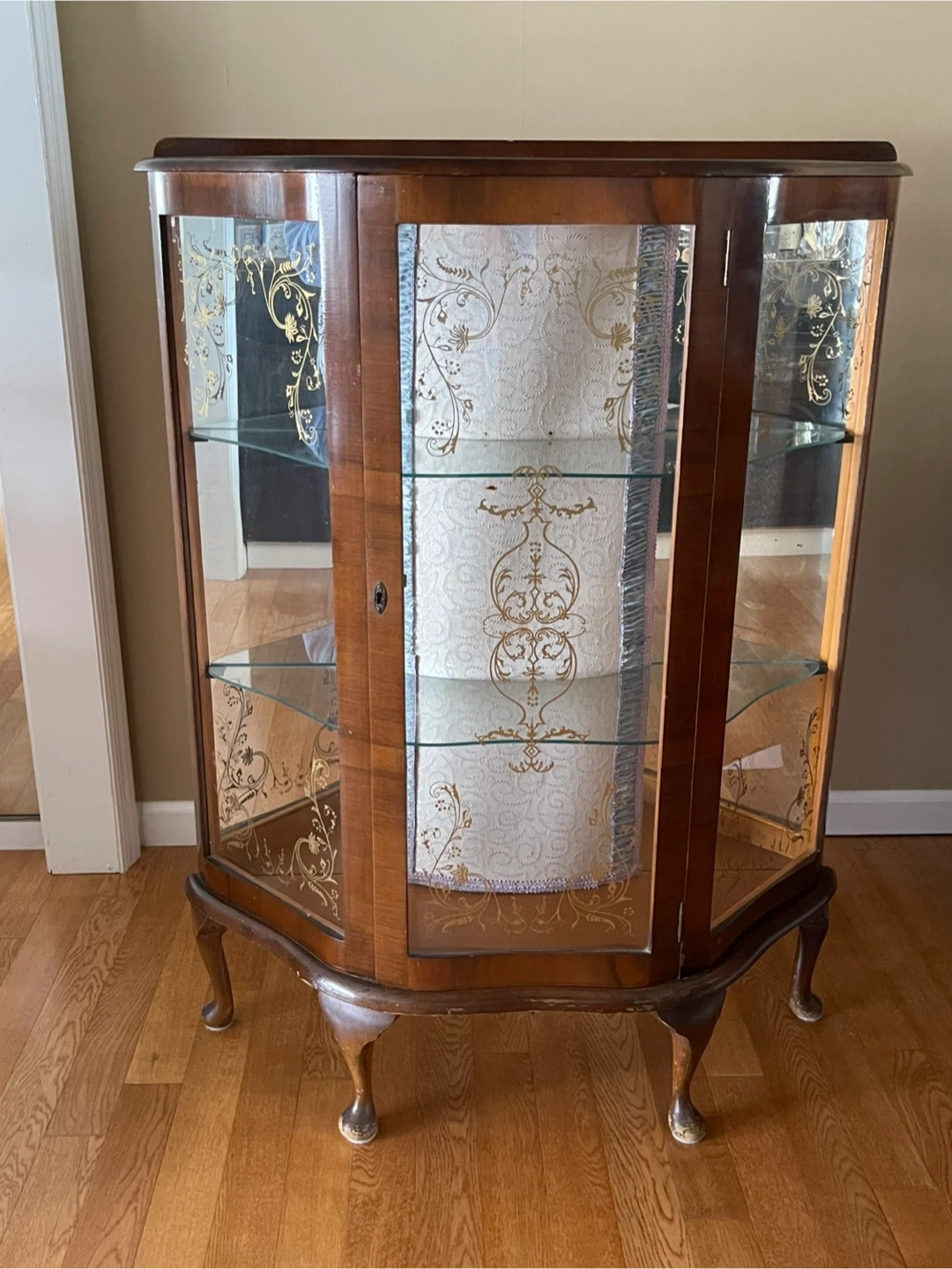 10Selling a vintage curio cabinet with glass shelves and decorative gold accents on the glass. It features a dark wood finish and unique curved design. Perfect for displaying collectibles or adding a touch of vintage charm to your home!