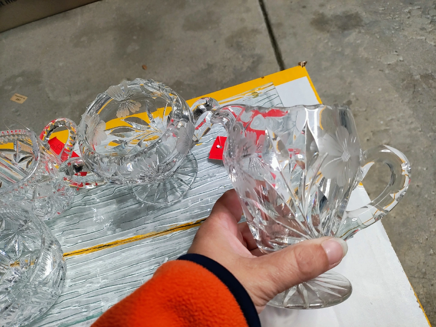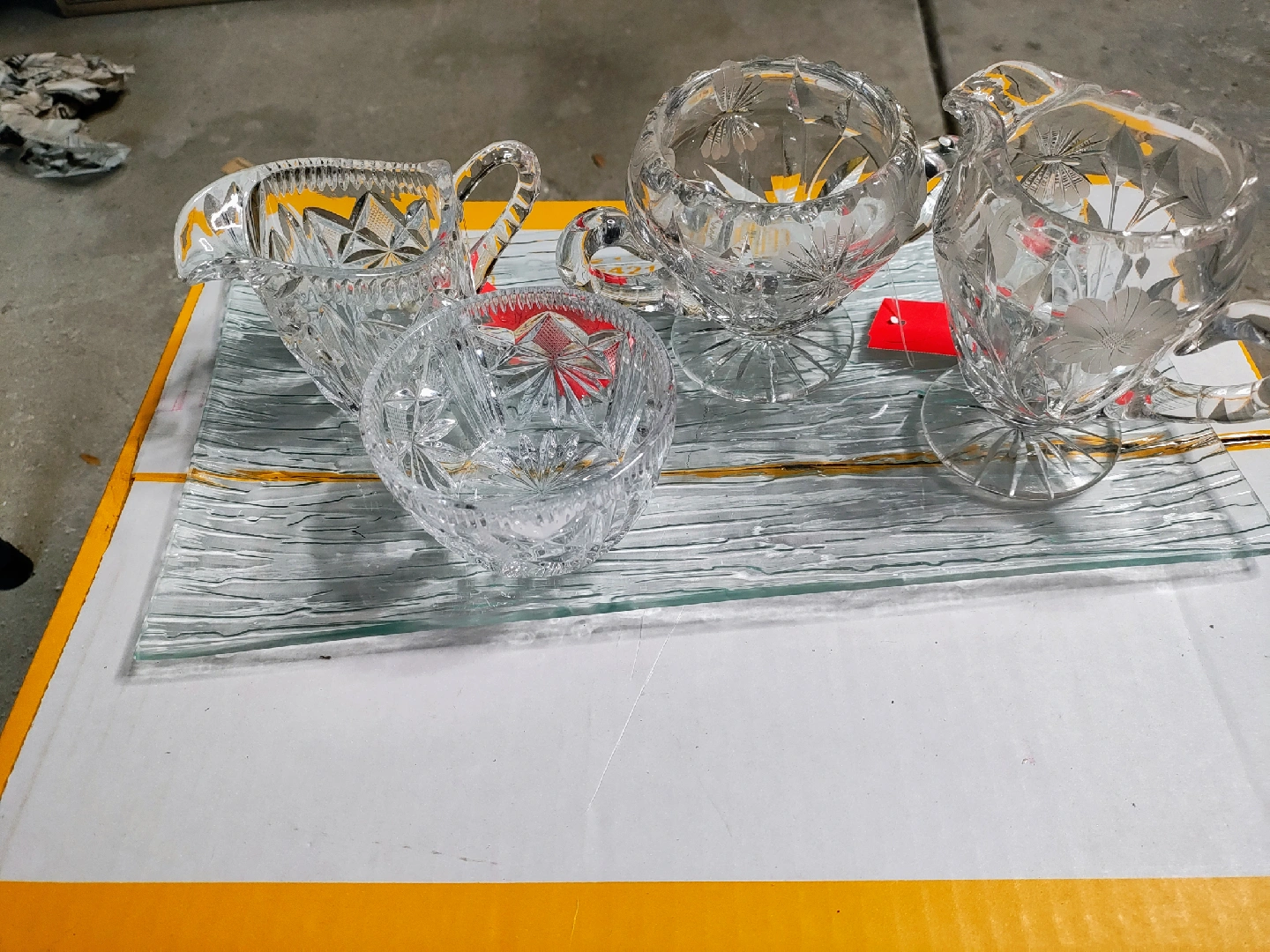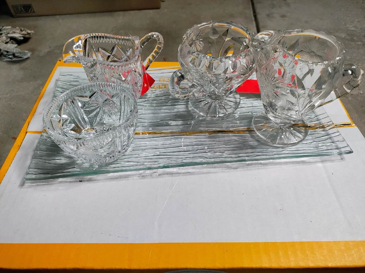 Selling a beautiful vintage cut crystal set! Includes (2) creamer, (2) sugar bowl, and a decorative plate. The intricate designs catch the light wonderfully, making it a lovely addition to any table setting