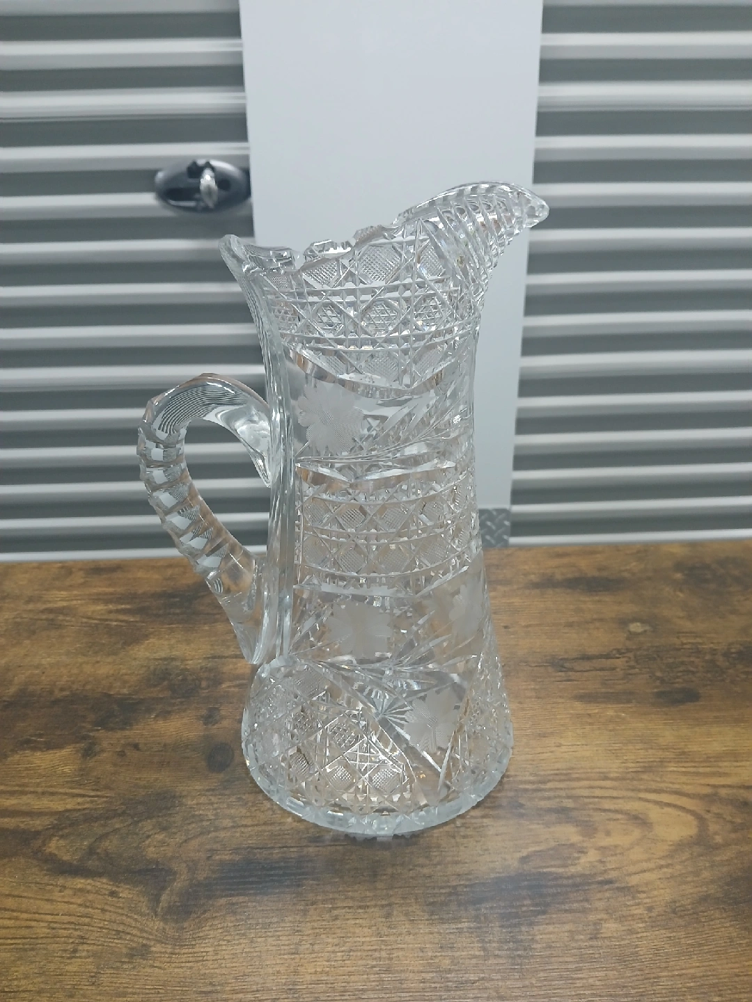 84Selling a beautiful vintage cut crystal pitcher! It features intricate patterns and a classic design. Perfect for serving drinks or as a decorative piece