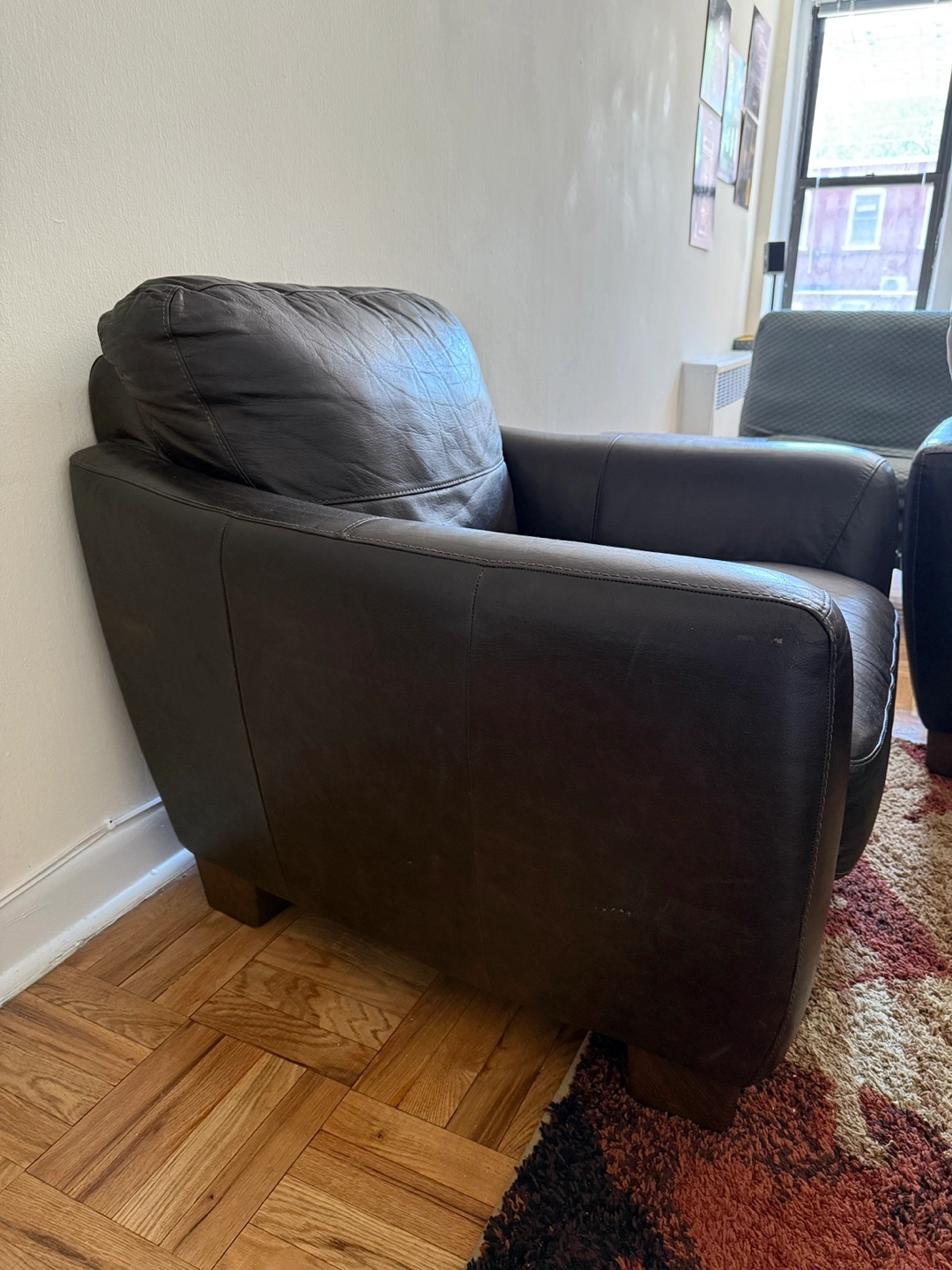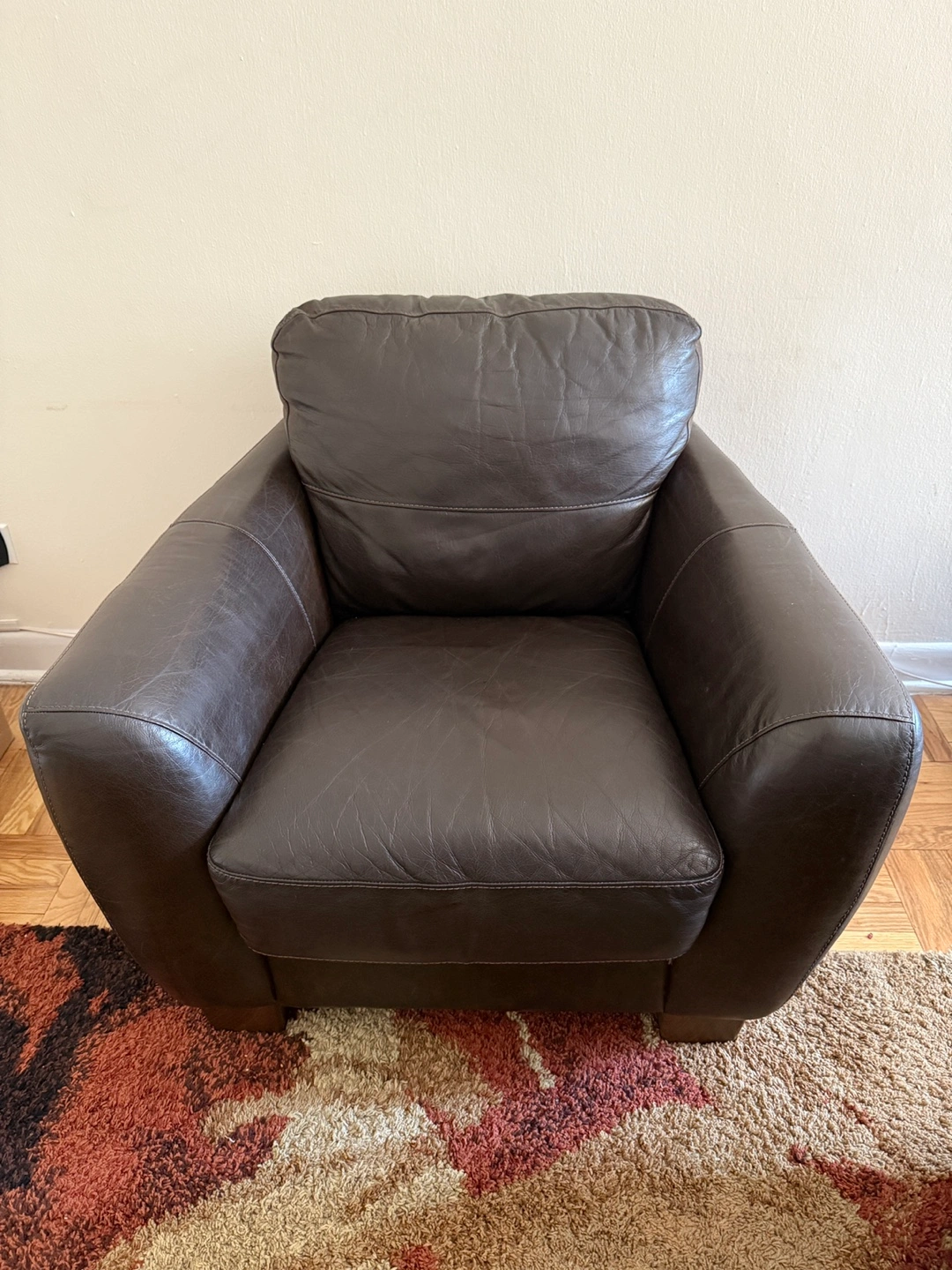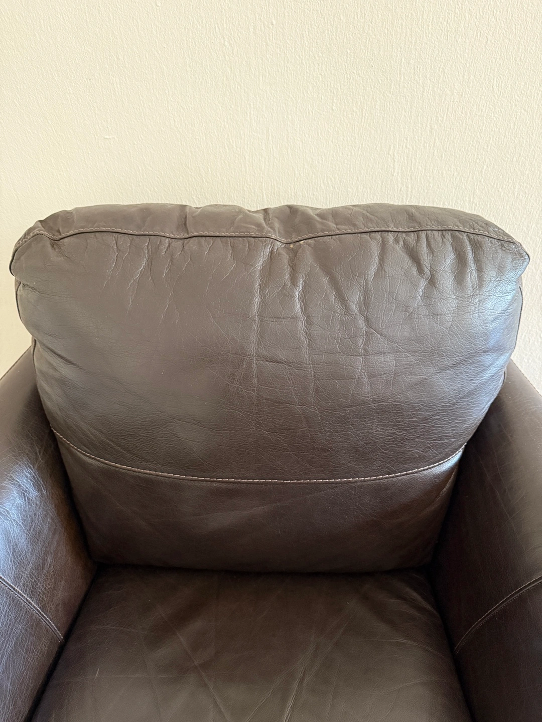10Selling a r put eal leather arm chair in great condition. The dark brown finish and clean lines make it versatile for any living space. Cushions are still supportive, offering a cozy, structured seat. Minimal wear with light surface scratches consistent with gentle use — no tears or sagging. A high-quality, durable chair that will definitely add warmth to your home. Dimensions available on request. Open to price negotiations. Pickup only.