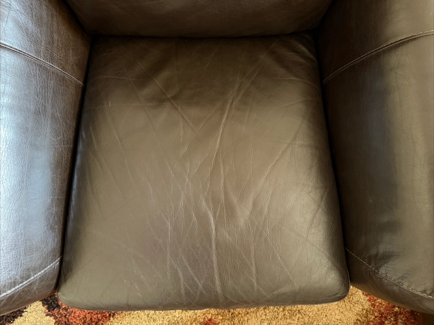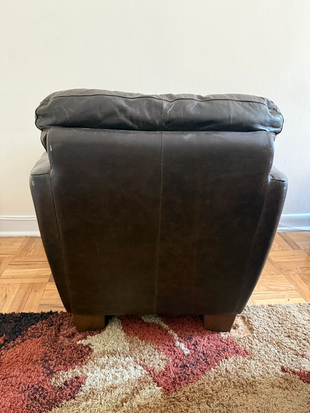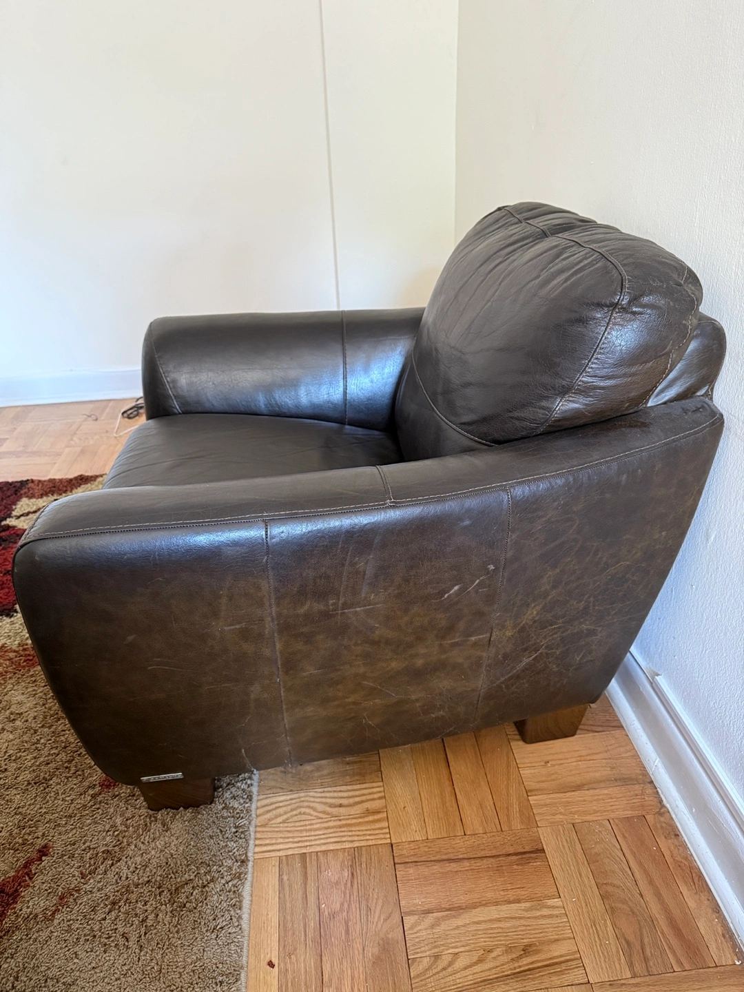 10Selling a r put eal leather arm chair in great condition. The dark brown finish and clean lines make it versatile for any living space. Cushions are still supportive, offering a cozy, structured seat. Minimal wear with light surface scratches consistent with gentle use — no tears or sagging. A high-quality, durable chair that will definitely add warmth to your home. Dimensions available on request. Open to price negotiations. Pickup only.