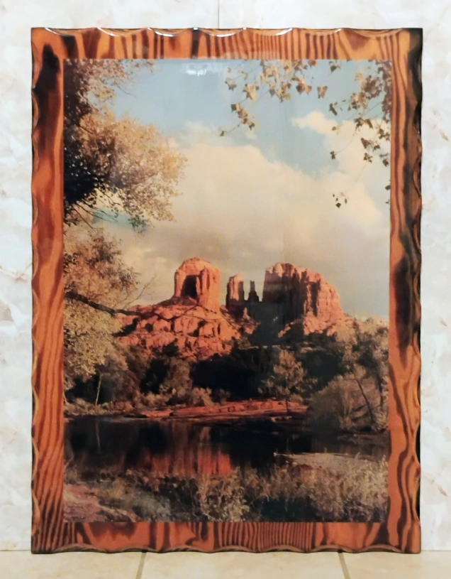 Vintage - Circa 1970's. Carved solid wood and lacquered decoupage print of the "Red Rocks" in Arizona picture. 32" high x 24" wide. Mounting hardware on the back. Handcrafted in California, U.S.A. (Birds Picture Factory). Like new. No chips, cracks or marring. Non-smoking and pet free home. CASH ONLY at time of pick-up in Gilberts, IL. No other form of payment accepted. No delivery or shipping available.