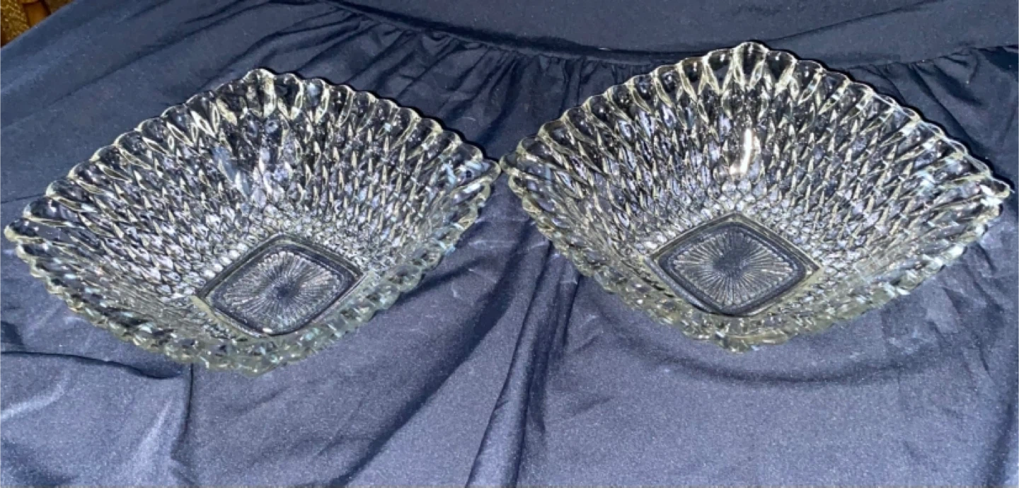 Selling a set of two vintage diamond cut glass bowls. They have a beautiful, intricate design and would make a lovely addition to any home. Perfect for serving snacks, desserts, or as decorative pieces!