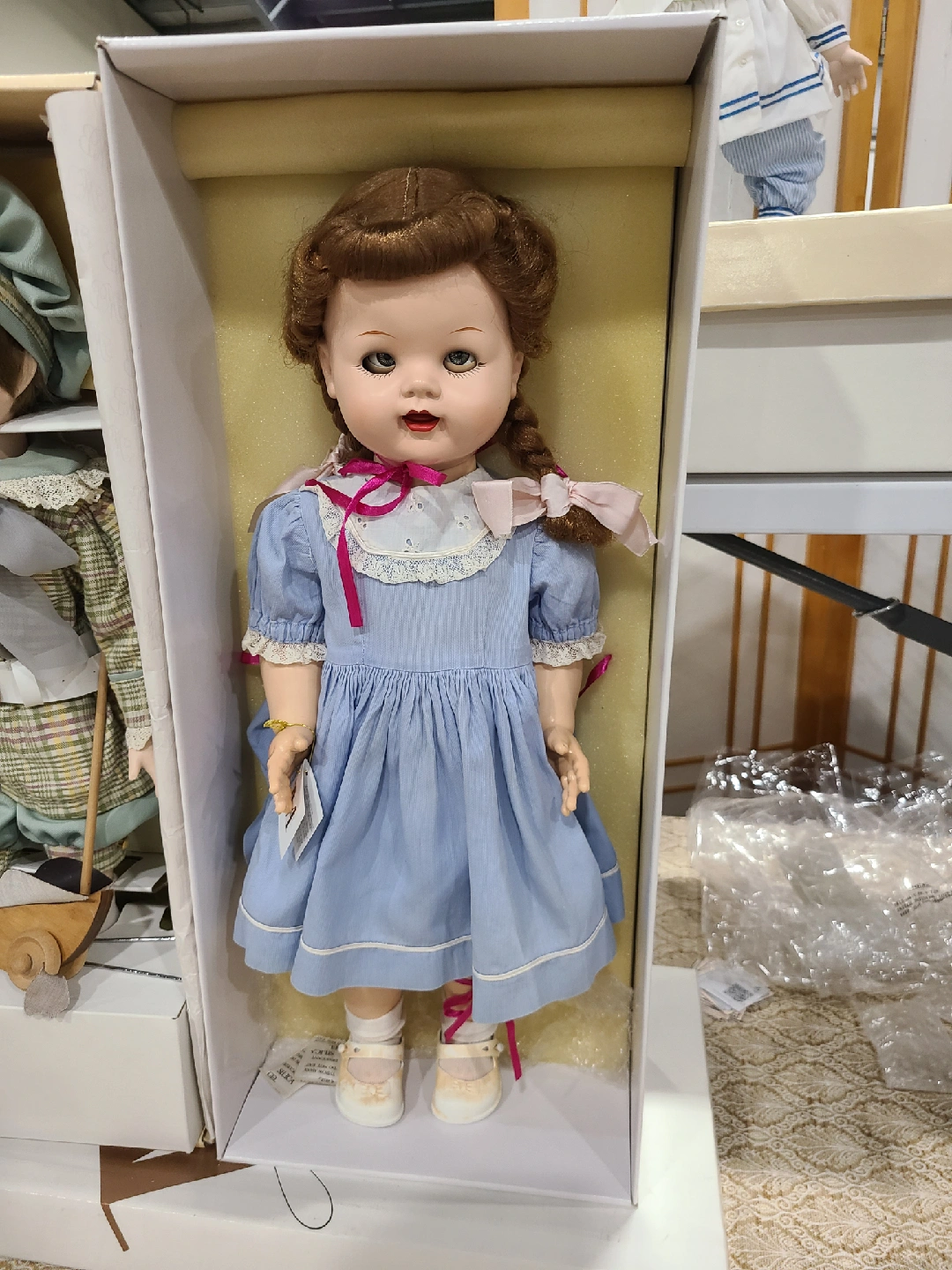Selling a vintage doll in a light blue dress. She has brown hair styled in braids and comes in her original box. A charming addition to any doll collection!