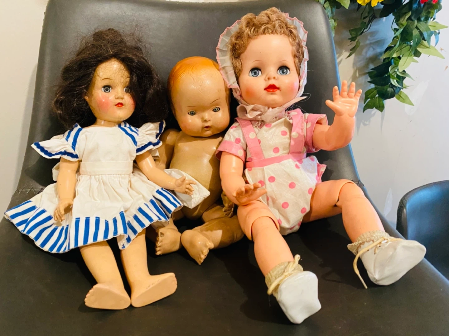 10Here's a set of three vintage dolls! They have a lot of character and would be great for a collector or for display. The Toni doll on the left is wearing a white dress with blue stripes, and the doll on the right is wearing a pink and white polka dot outfit. The doll in the middle is nude.