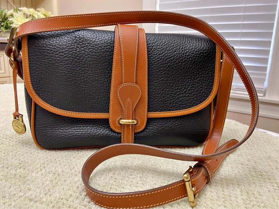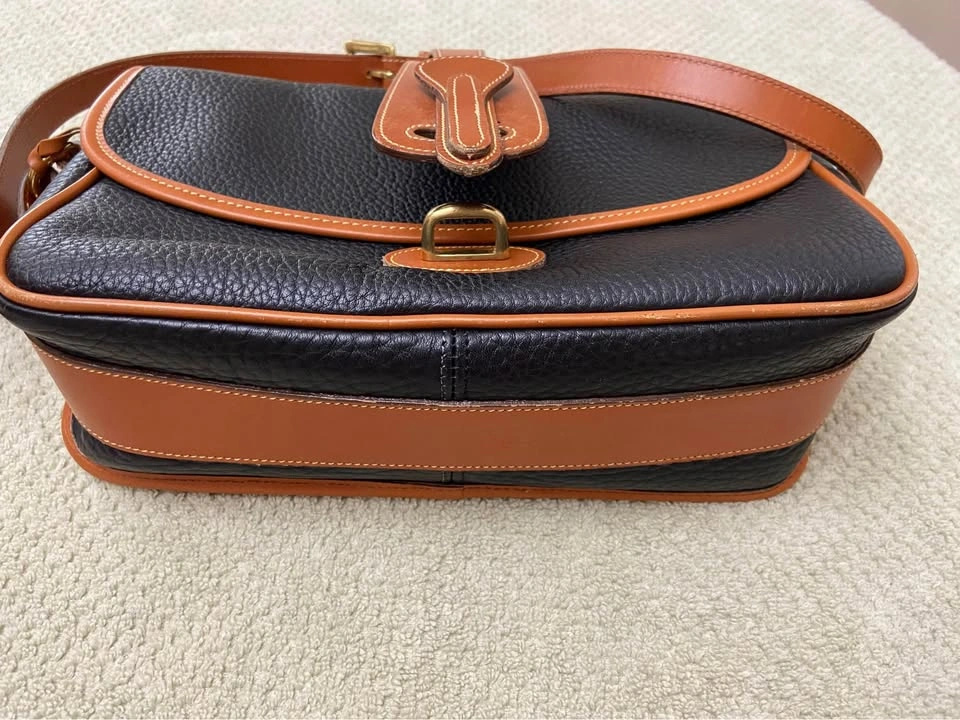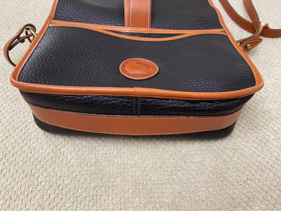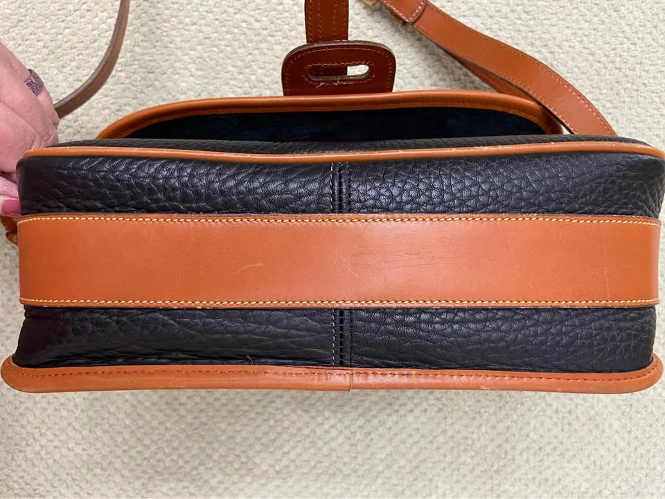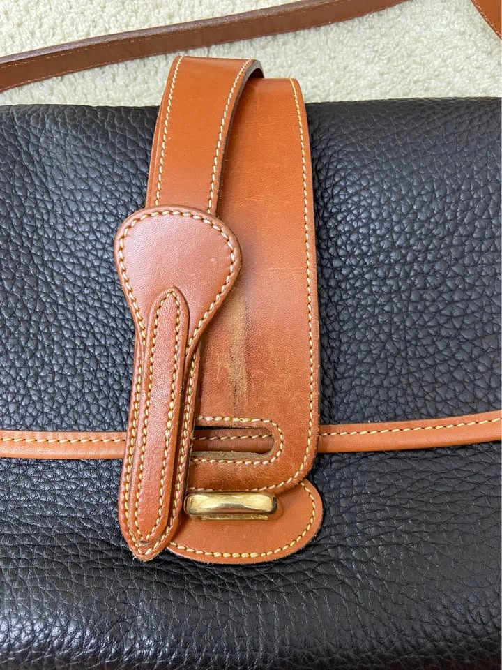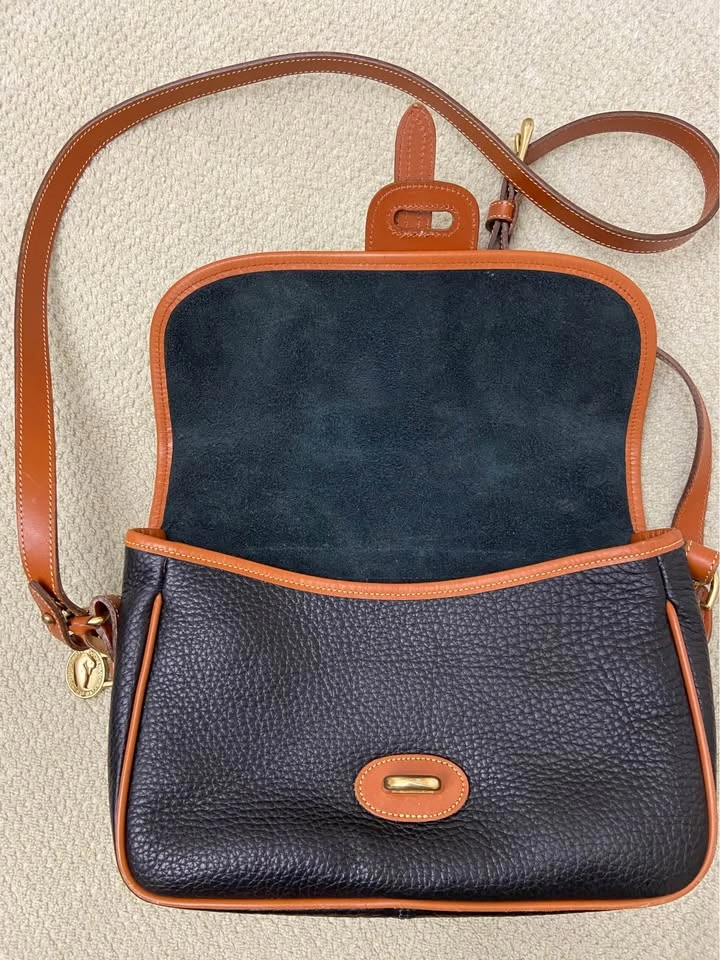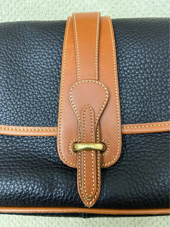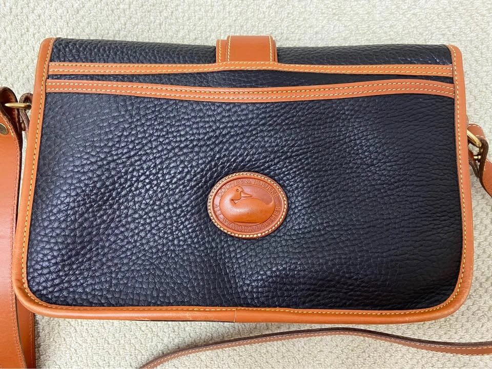 76Vintage Dooney & Bourke All Weather Leather (AWL) Equestrian Bag, in Navy Blue with British Tan Leather Trim. Authentic. Excellent vintage condition for a bag that is 25+ years old! Very well cared for, has been carefully packed away for years. One owner, my MIL. Produced in the 1990’s. Made in the USA. Serial # in photos. Navy blue AWL pebbled exterior, in excellent condition, no tears, stains or scratches. Navy blue suede lining in excellent condition, no tears or stains. Internal zip pocket, with 6 slip-pocket card organizer. Large exterior back slip-pocket…large enough for iPhones. Adjustable and removable leather shoulder strap/Crossbody strap, in great condition. Hanging brass duck bag charm. Leather duck logo patch. All brass hardware. Bag has a front flap closure, with leather strap and brass buckle detail. Minor/normal wear at bottom corners/few scuffs on tan leather trim/small white dot on back to the left of duck logo/normal wear behind leather tongue-flap, not seen when in place…all above seen in last 4 photos. Approx 6-1/2” H, 10-1/2” L, 3-1/2” D. Cash only. Meet in Garfield Ridge, Chicago, near Midway. Willing to meet near Oak Lawn, EP, Alsip, Orland, Palos, Countryside, LaGrange, Burr Ridge, Hinsdale, Darien ☺️
