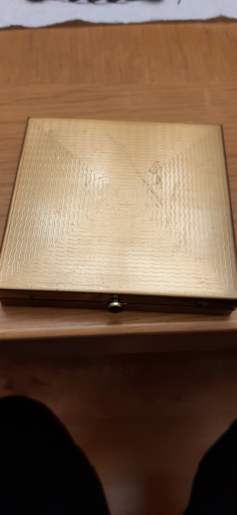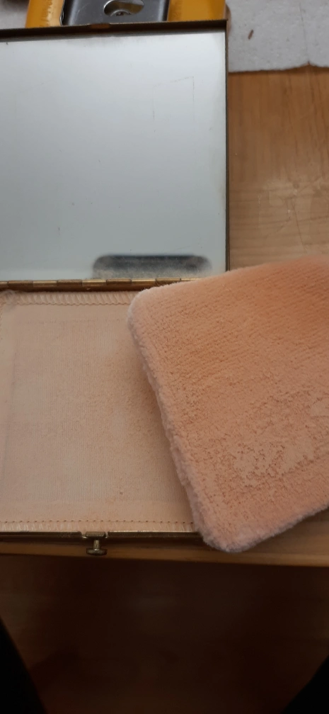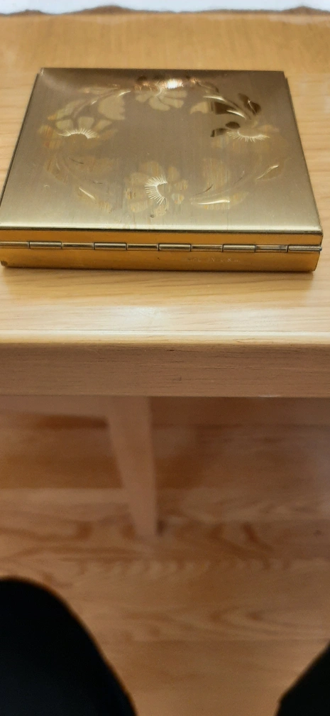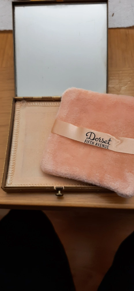 40Vintage face powder compact looks to be from the 1930s or early 1940s and was made by the famous Dorset Fifth Avenue. Made of gold tone metal with a satin finish, this piece has a lovely gold flower wreath printed on the cover. There is a round push button clasp which leads to an interior with a glass mirror inside the cover and a powder well inside the base. The powder well has the original powder screen and some original loose powder make up is still inside. The Original puff is a soft fuzzy pink pillow style puff with a pink ribbon handle that is marked Dorset Fifth Avenue. the bottom of the compact is a gold tone metal with an etched square with a share design