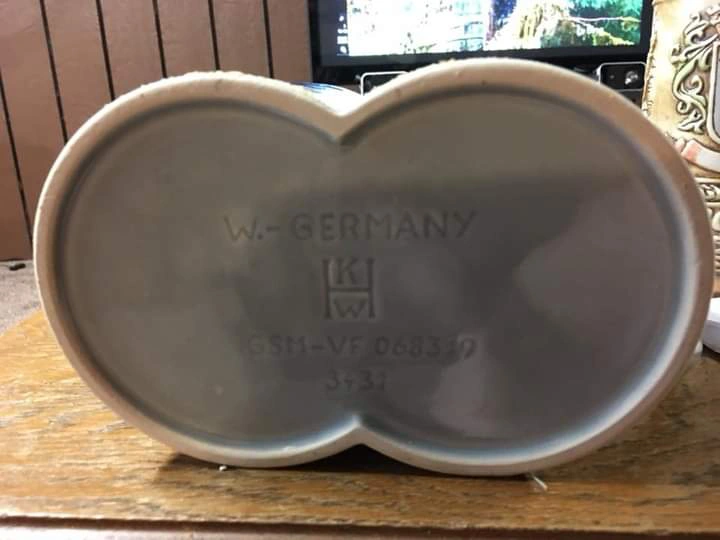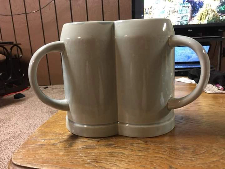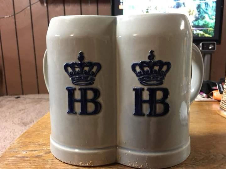 A unique beer stein. With two sides and two handles. The design includes a crown and the letters HB. Enjoying a drink from this stein is a wonderful way to end your day.