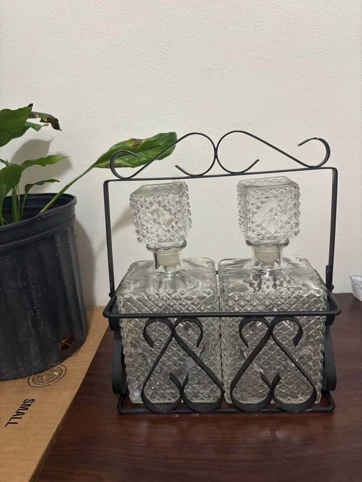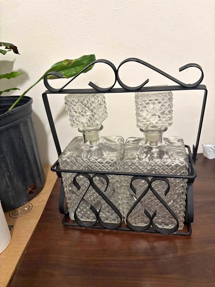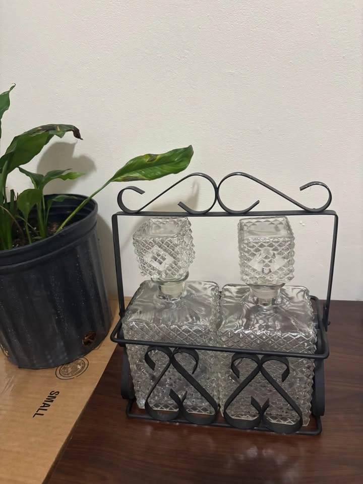 Vintage double decanter with metal frame. Looks great, works well. Pickup in hells kitchen