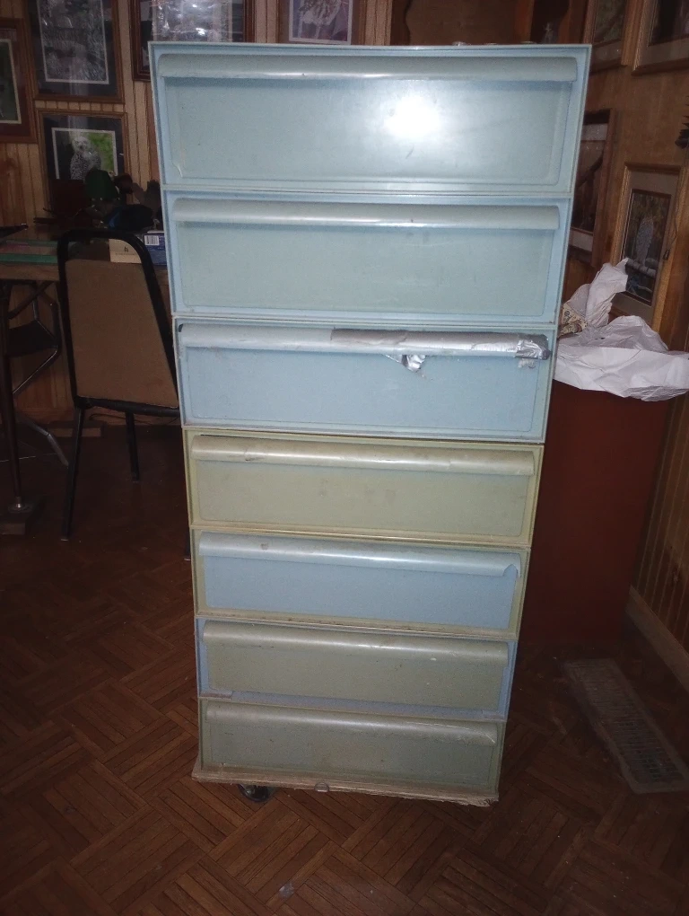 60Here's a vintage plastic drawer cabinet with 6 drawers! It has a unique look and could be a fun addition to your space. It shows some signs of wear, but still has plenty of life left