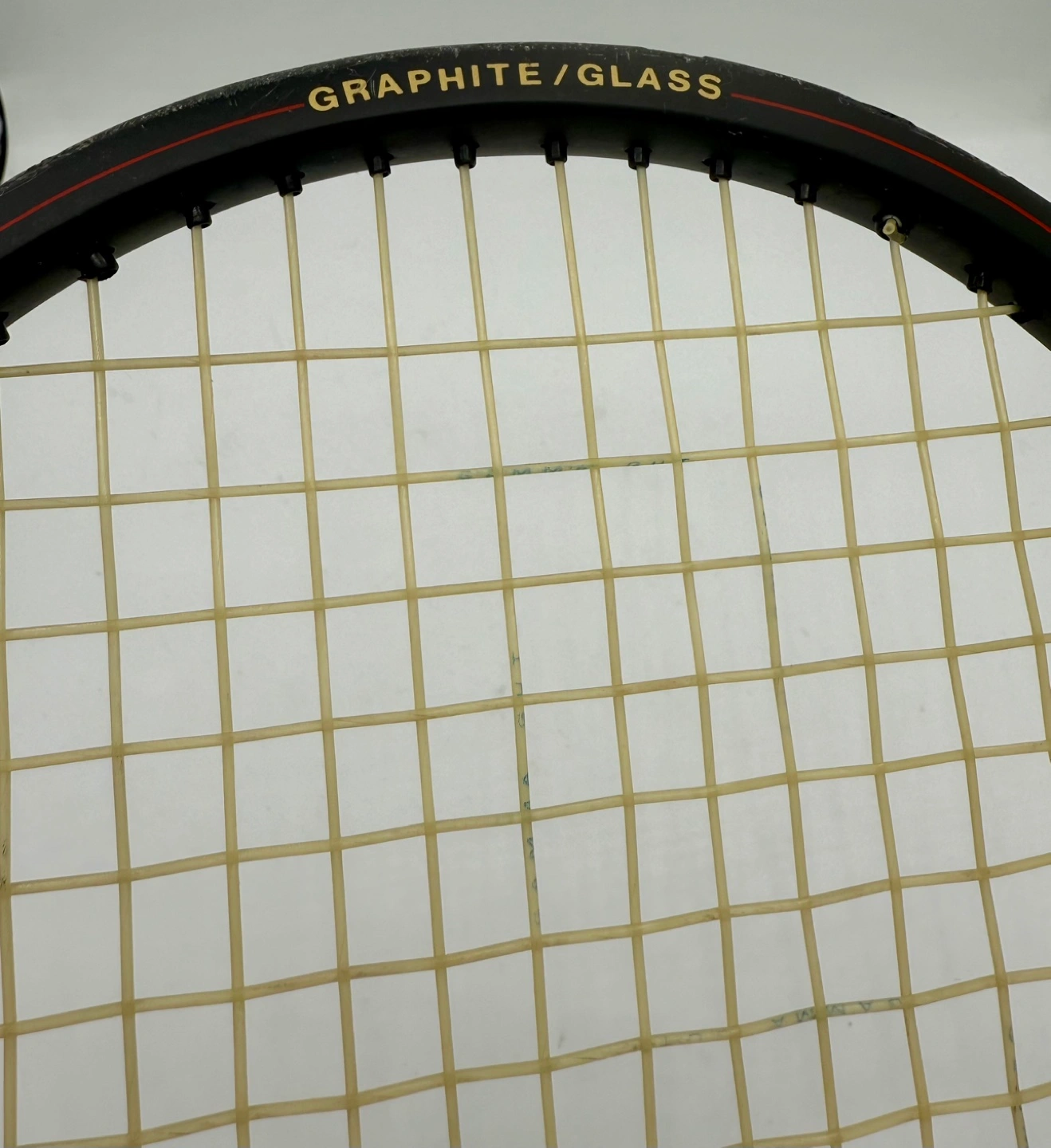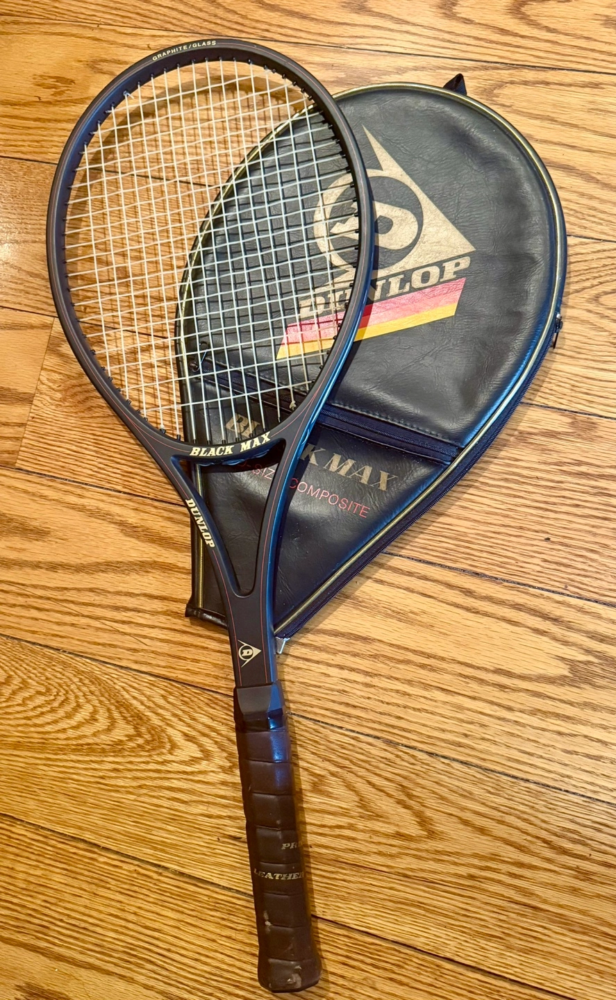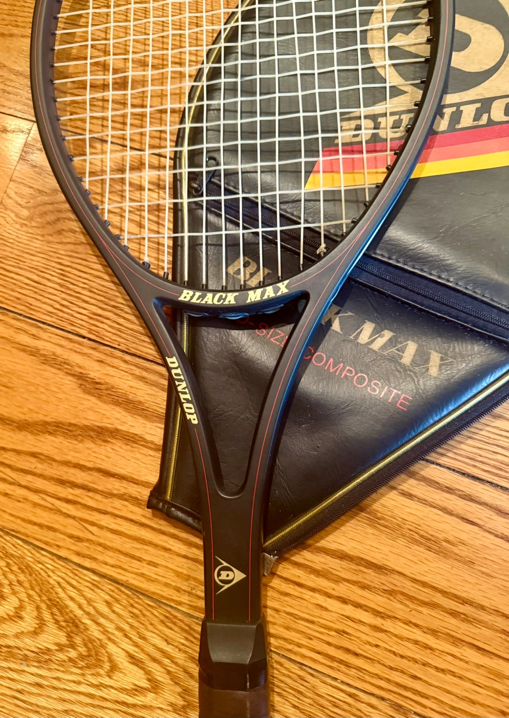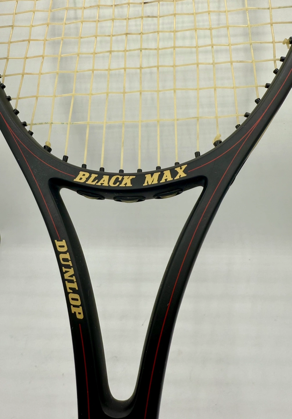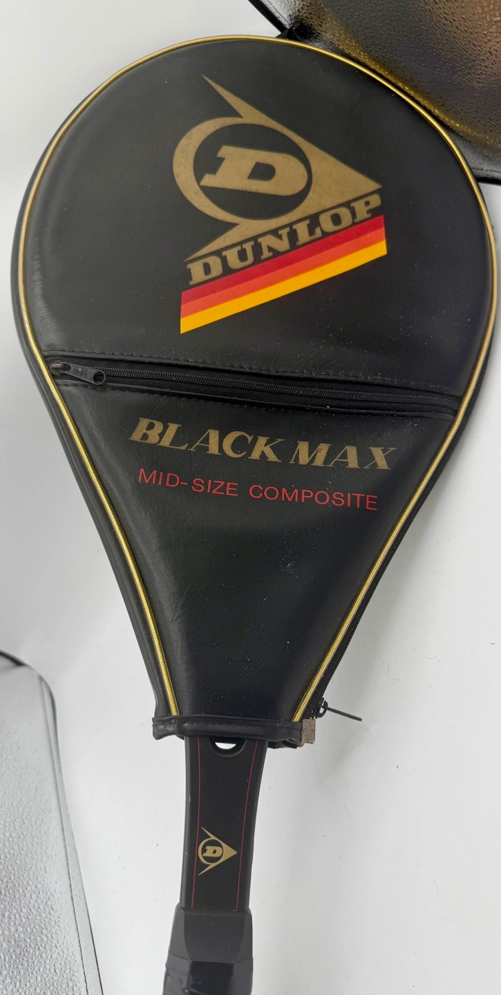 13Vintage Dunlop Black Max mid-size composite tennis racket. Graphite/glass. Includes a matching carrying case. Made in Taiwan.