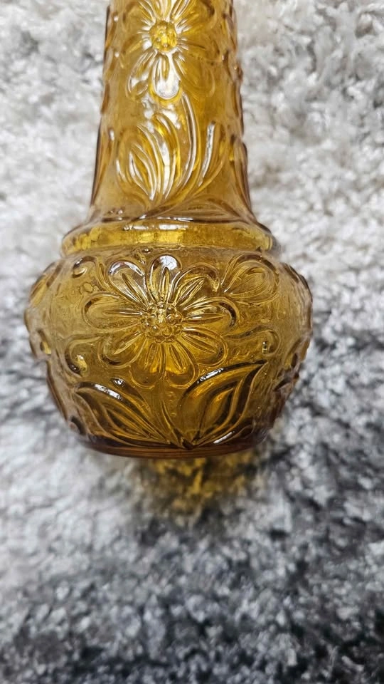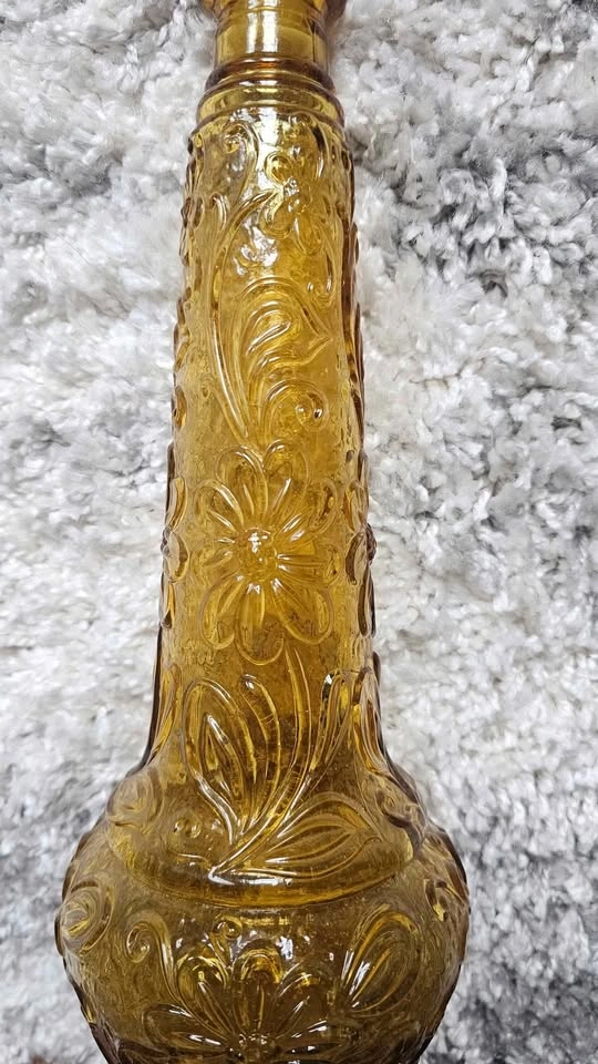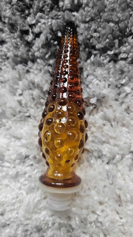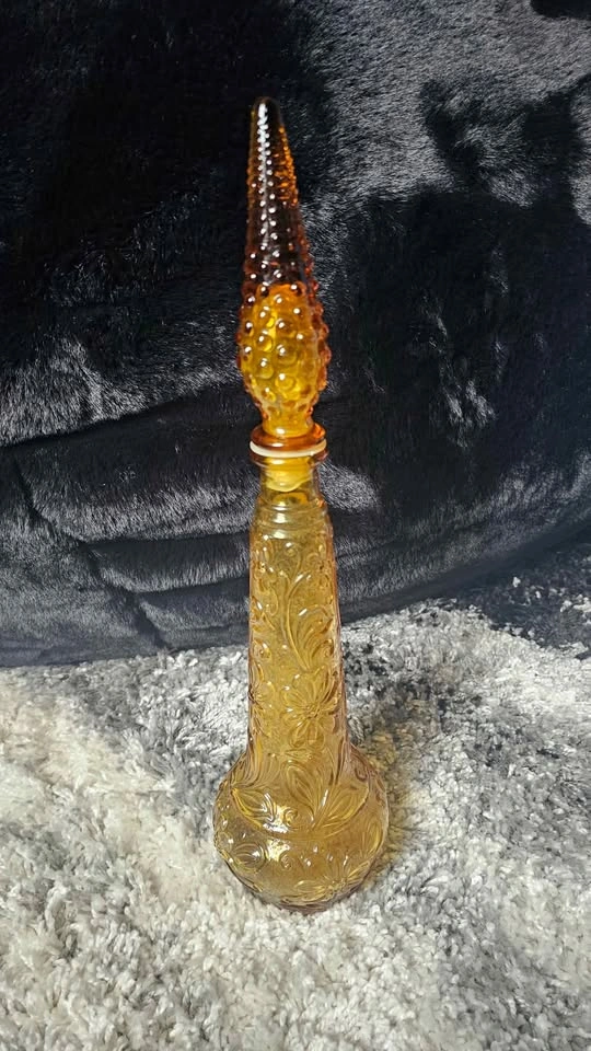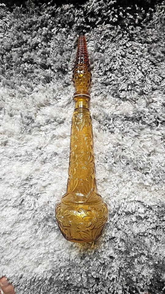 The Vintage Empoli Rossini Bubble Glass Genie Bottle Decanter in Amber is a stunning piece of Mid-Century Modern glassware from Italy. Standing at 22.5", this decorative decanter features a bubble pattern and a glossy finish. With a lid/stopper, it adds a touch of elegance to any barware collection. This vintage piece captures the unique style and craftsmanship of the 1960s, making it a standout piece for collectors of art glass and Mid-Century Modern decor.