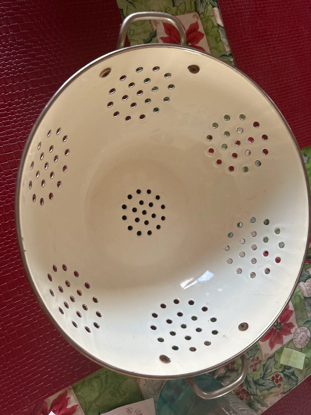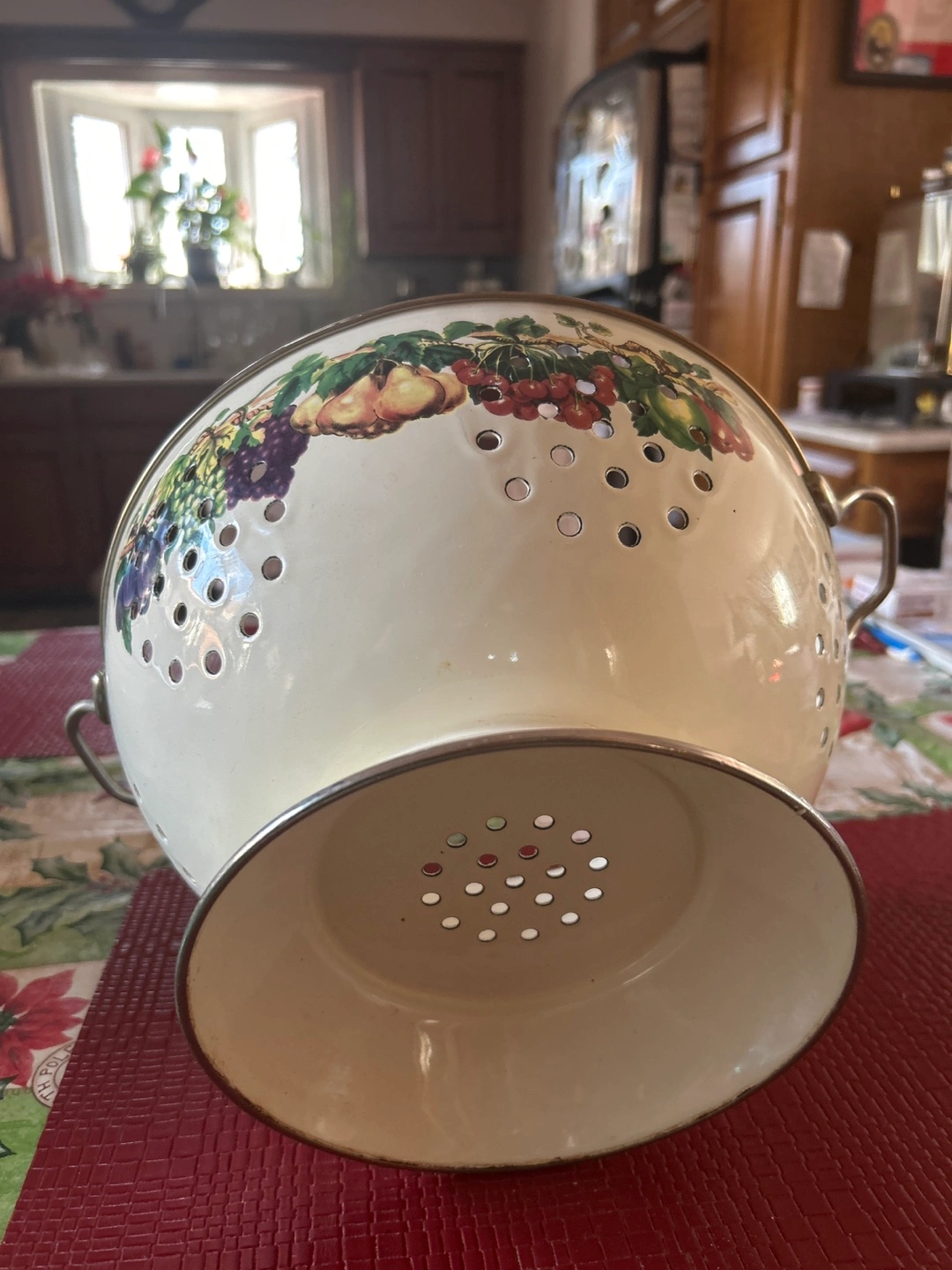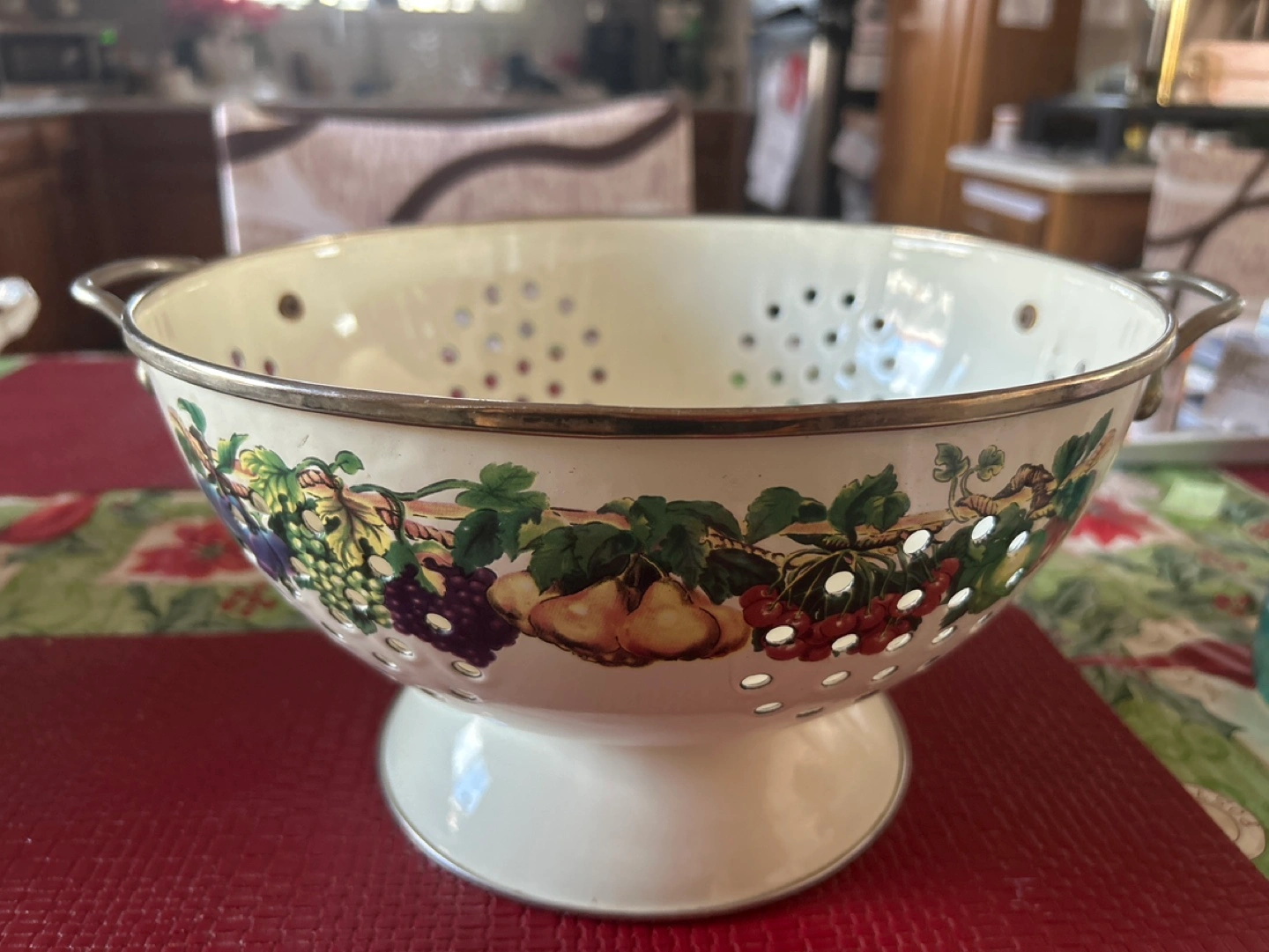 Cream-colored enamel colander. Features a fruit design and two handles. Perfect for kitchen decor or use.