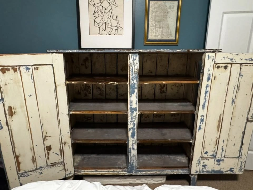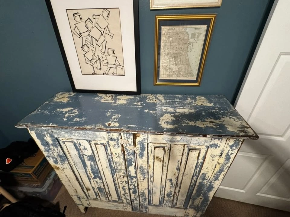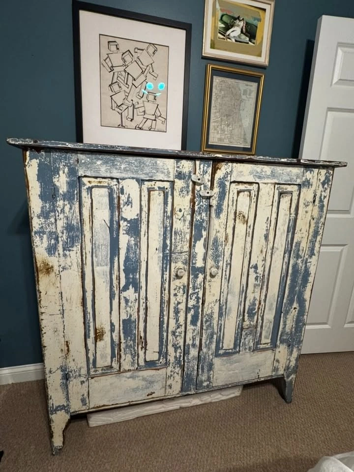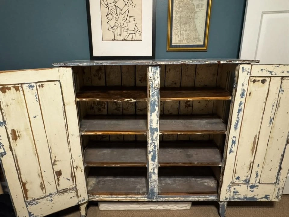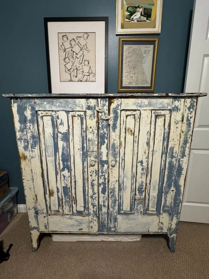 65Moving sale! Gorgeous vintage wooden cabinet with an authentic distressed patina — a perfect statement piece for farmhouse, cottage, or eclectic interiors. The naturally aged blue and cream paint gives it beautiful texture and warmth. Dimensions: approx. 51.5x52x17.5 Solid wood, very sturdy Two doors with working latches Four interior shelves for storage Distressed, rustic blue and cream paint Original antique condition (not reproduction) Perfect for an entryway, dining room, or living space. Full price was $1500. Pick up in Bucktown, Chicago.