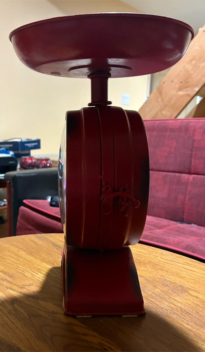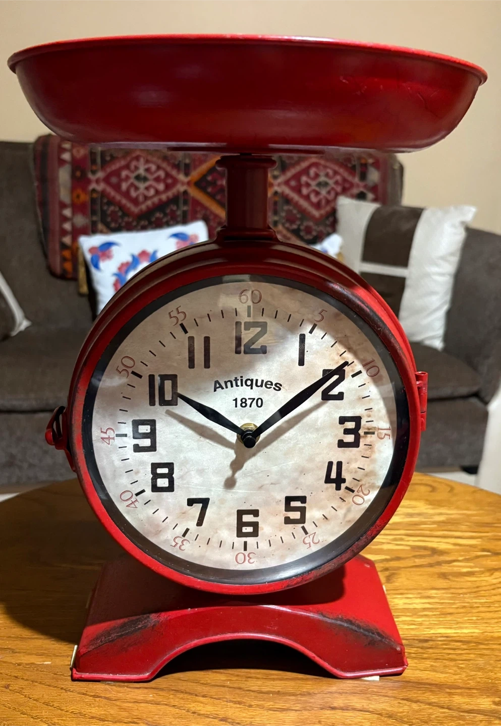 Vintage Farmhouse Kitchen Double Sided Clock Faux Scale Fruits Vegetable Decor Selling a charming red scale clock with an 'Antiques 1870' design! It's a unique piece that adds a vintage touch to any room. The clock face is easy to read, and the scale design is a fun conversation starter