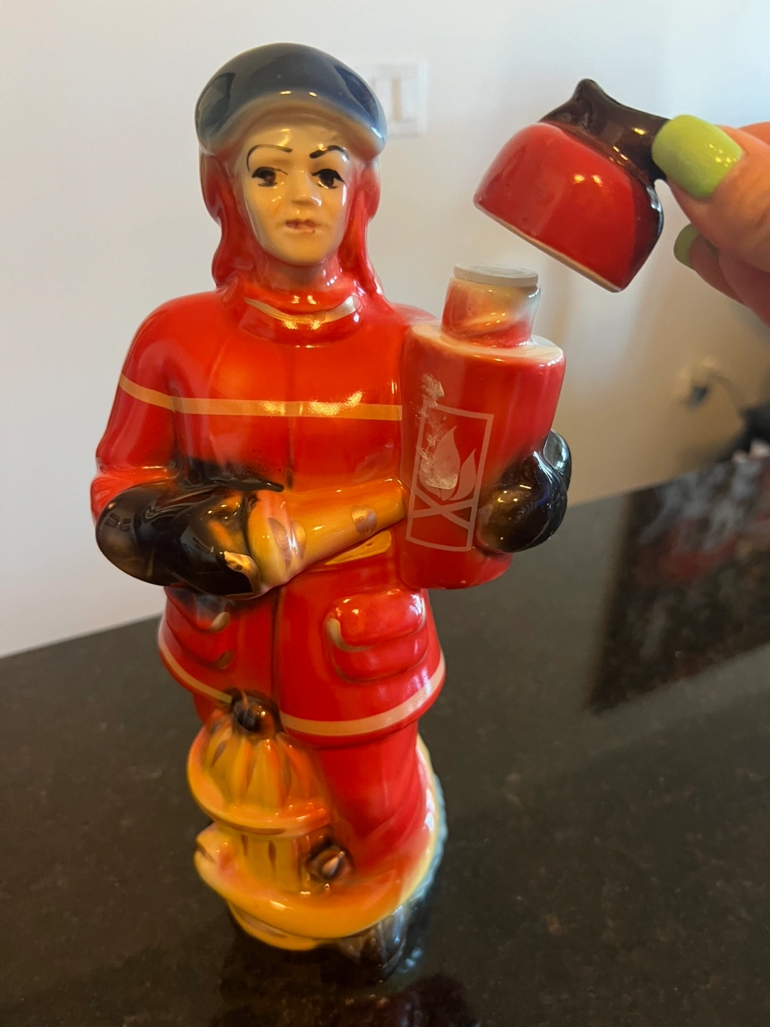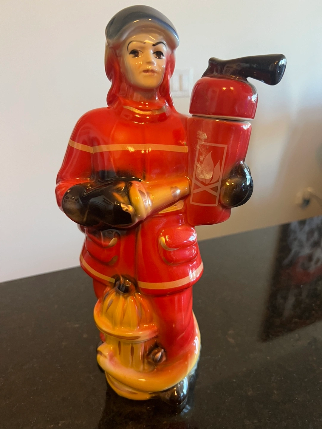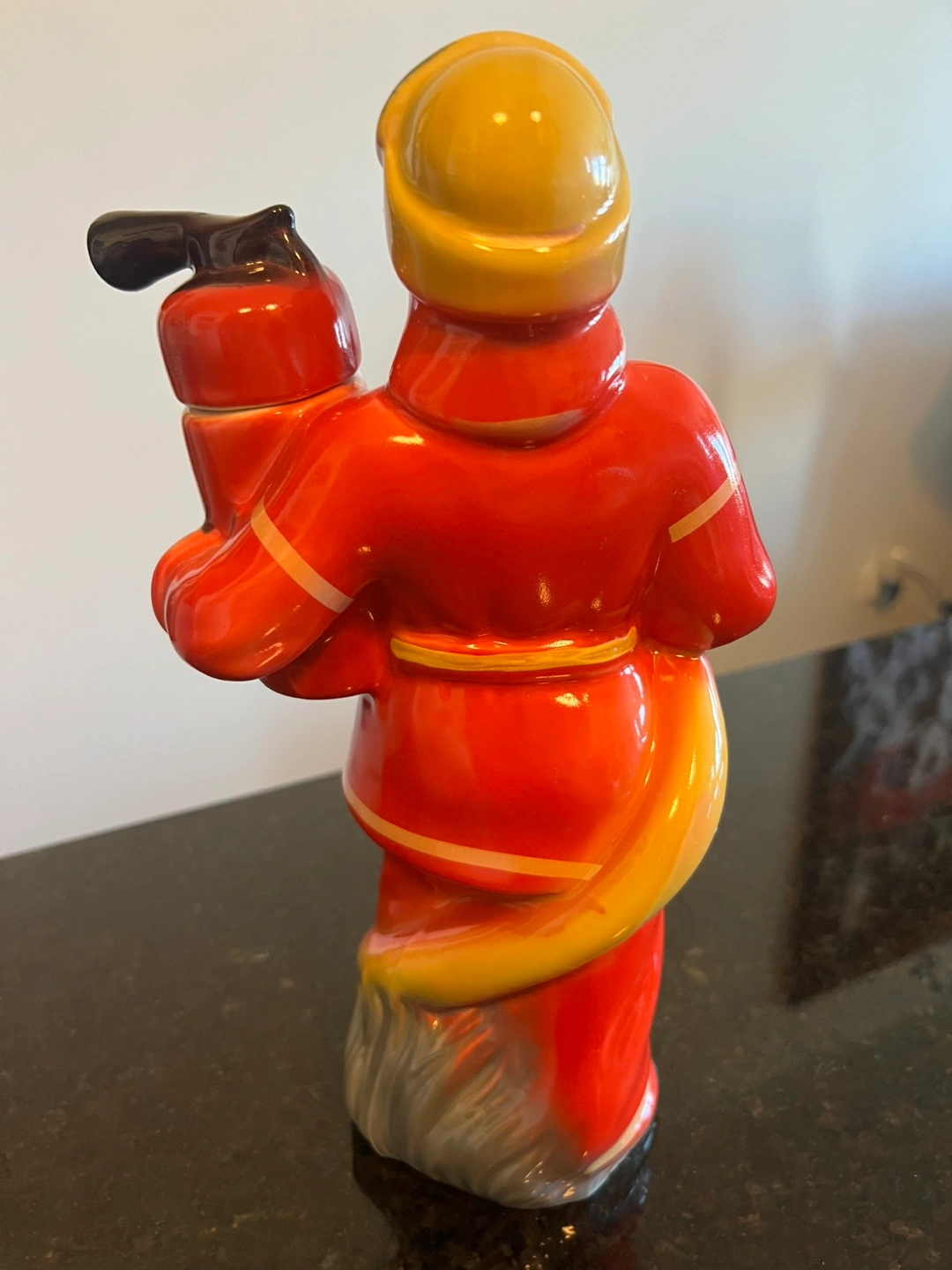 Collectible ceramic liquor decanter shaped like a firefighter. Features removable top. Unique and decorative.