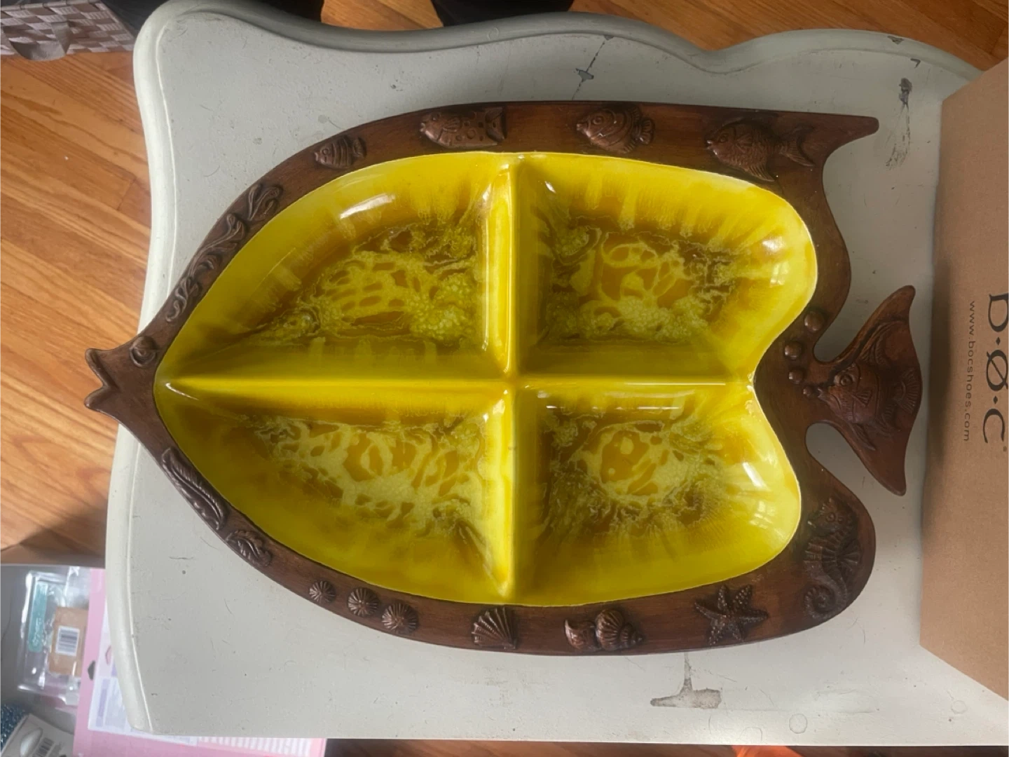 10This is a vintage Treasure Craft divided serving platter, often referred to as a "fish tray.” It features a yellow and brown "lava drip" glaze in the center and a faux wood-grain texture on the outer rim, which is decorated with various sea creatures like smaller fish, seashells, and a starfish. These platters were made in the USA, often in the 1960s or 1970s.