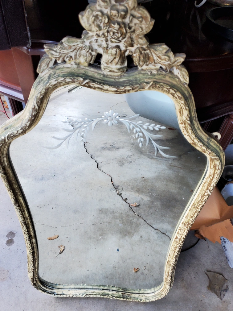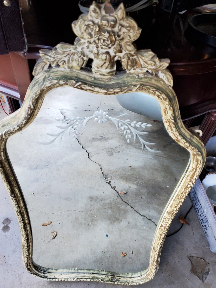 Selling a vintage mirror with a beautiful floral accent on top! It has a unique shape and design, perfect for adding a touch of elegance to any room. The mirror has some signs of wear, which add to its vintage charm