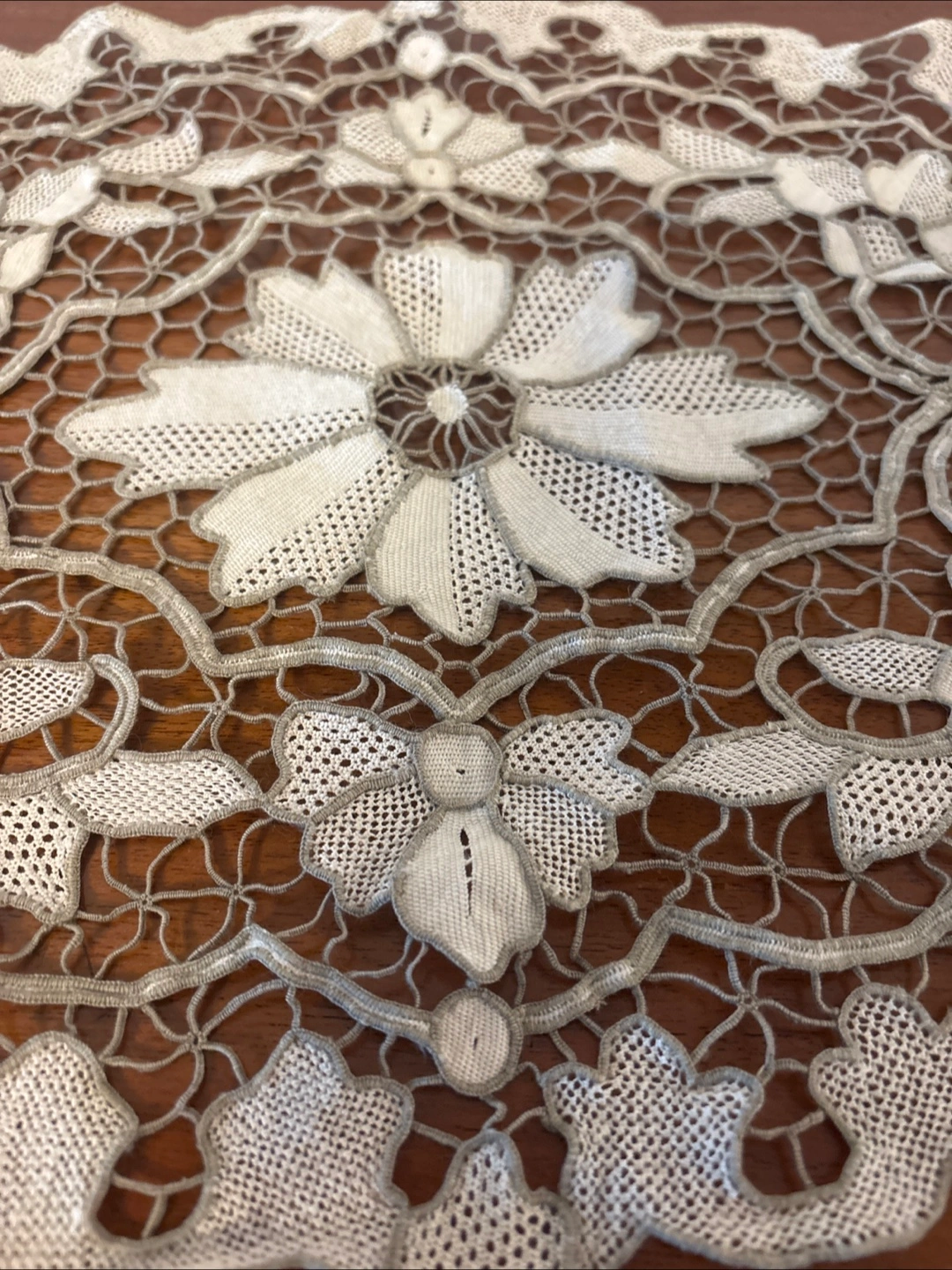 Beautiful vintage floral lace doily in excellent condition. Perfect for adding a touch of elegance to your home decor. The intricate floral design and delicate lace make it a unique and charming piece. It would look great on a table, dresser, or any other surface you want to adorn
