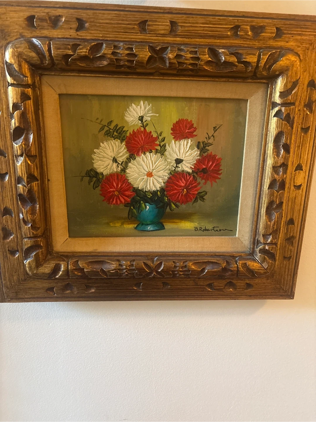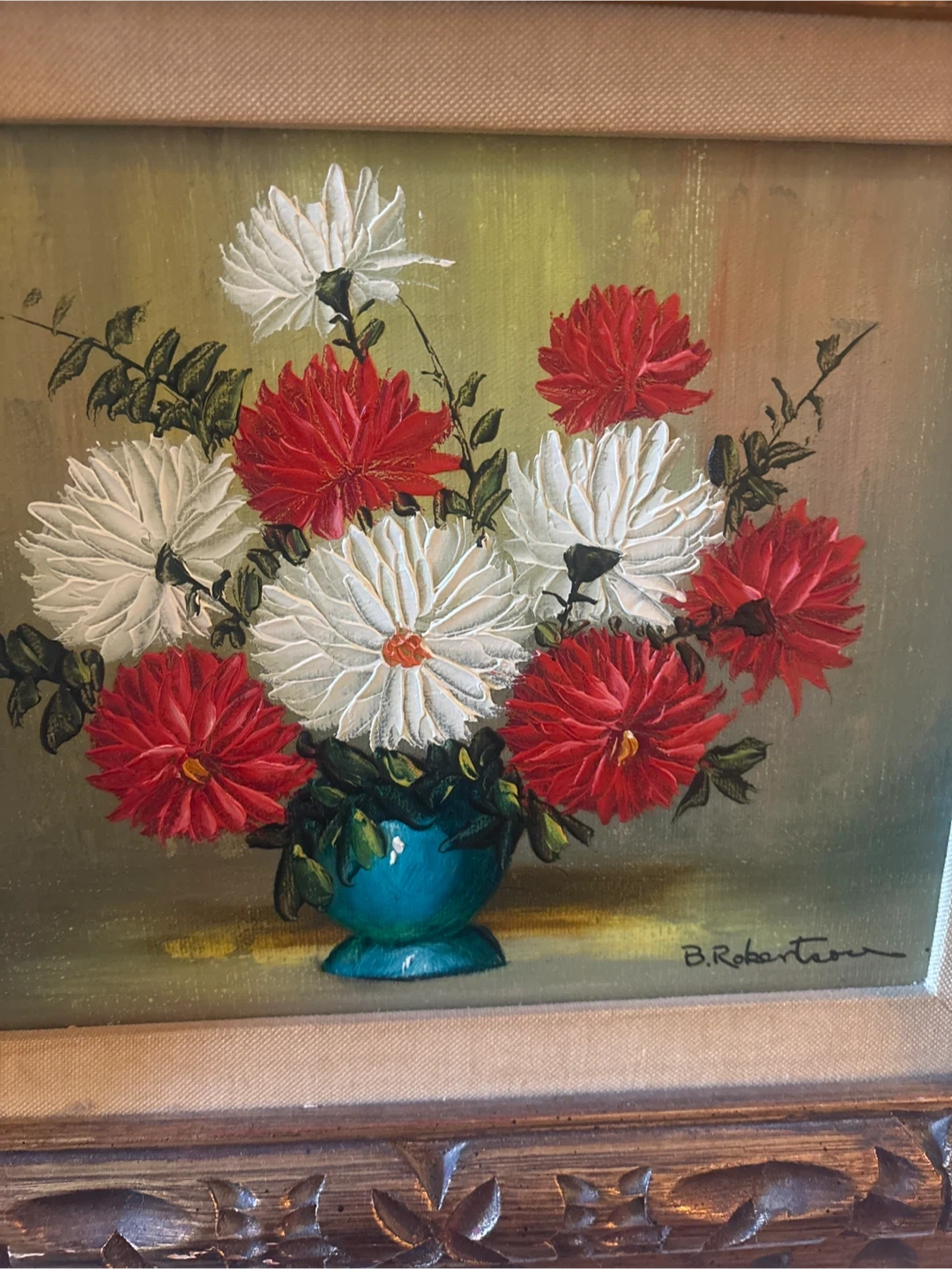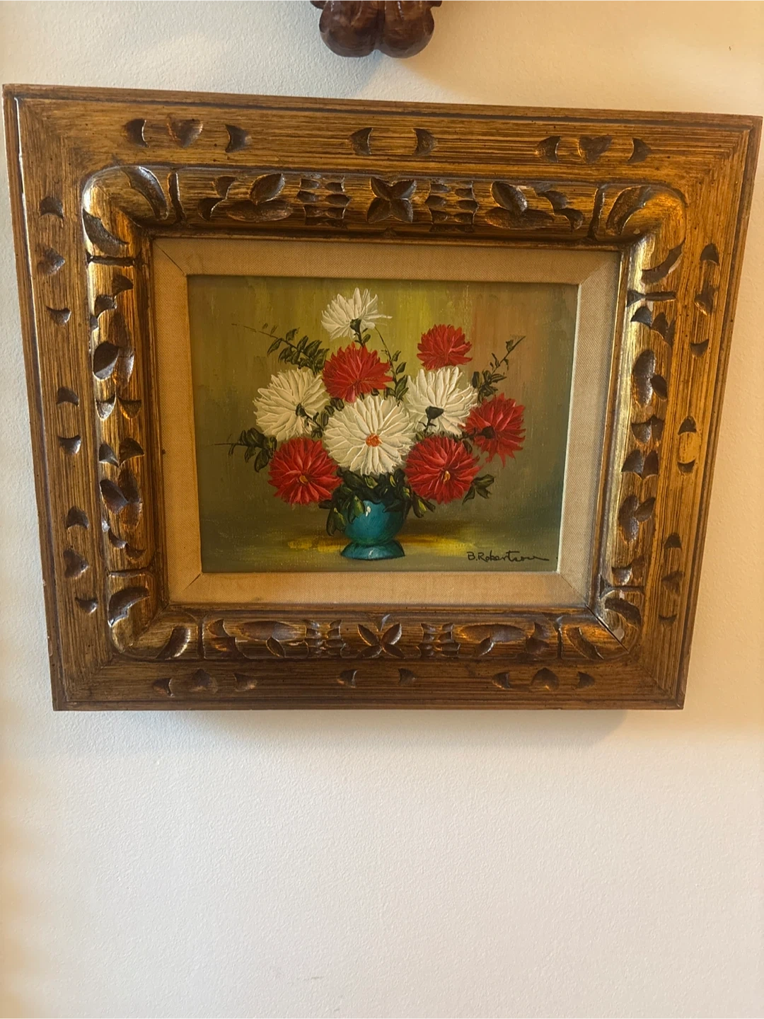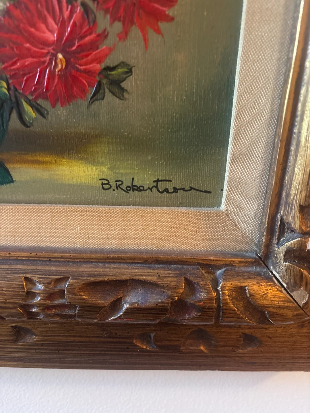 Beautiful vintage oil painting of flowers in a vase, with a lovely ornate gold frame. The painting is signed "B. Robertson". It would be a great addition to any home!width 17.5 , height 15 inches