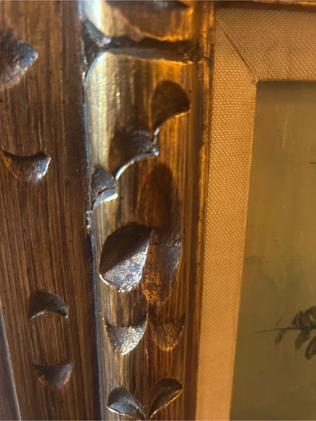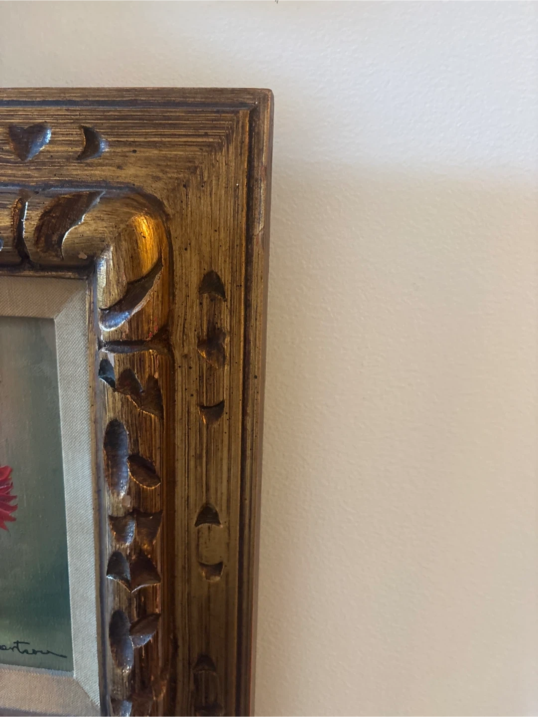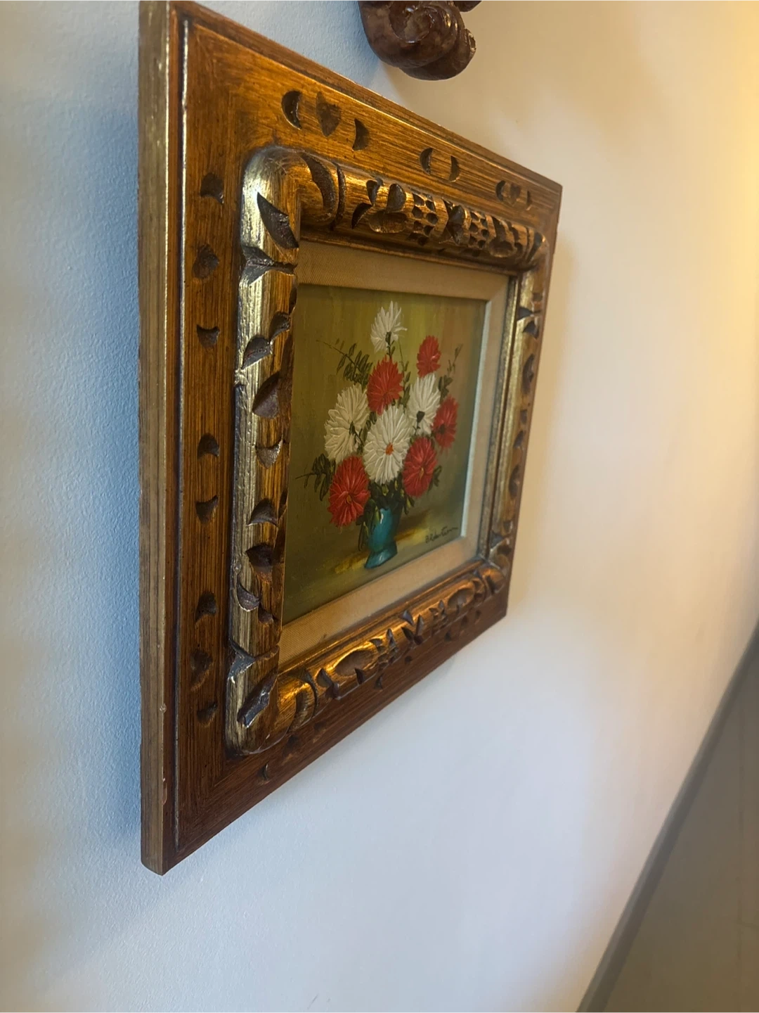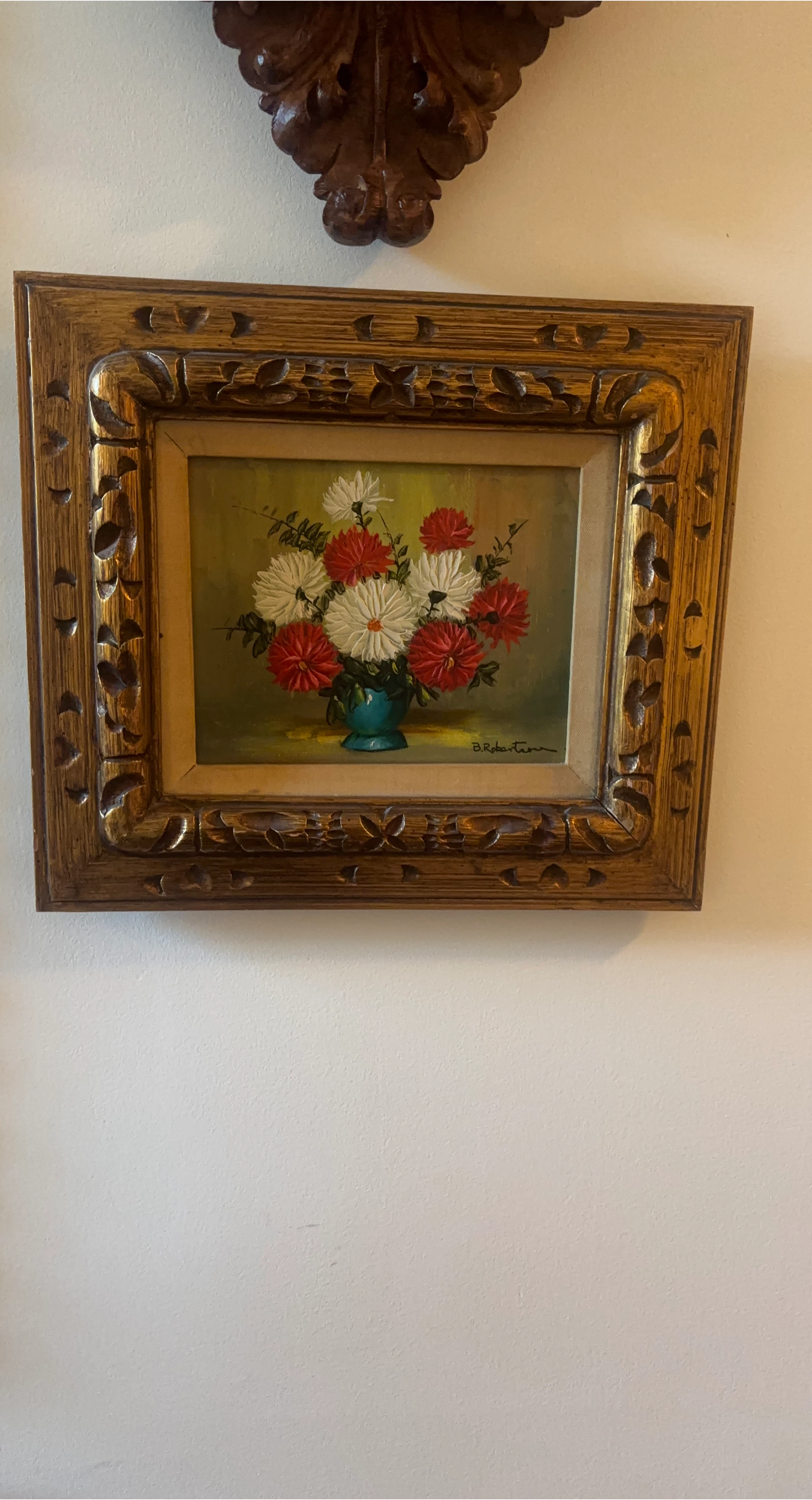 Beautiful vintage oil painting of flowers in a vase, with a lovely ornate gold frame. The painting is signed "B. Robertson". It would be a great addition to any home!width 17.5 , height 15 inches