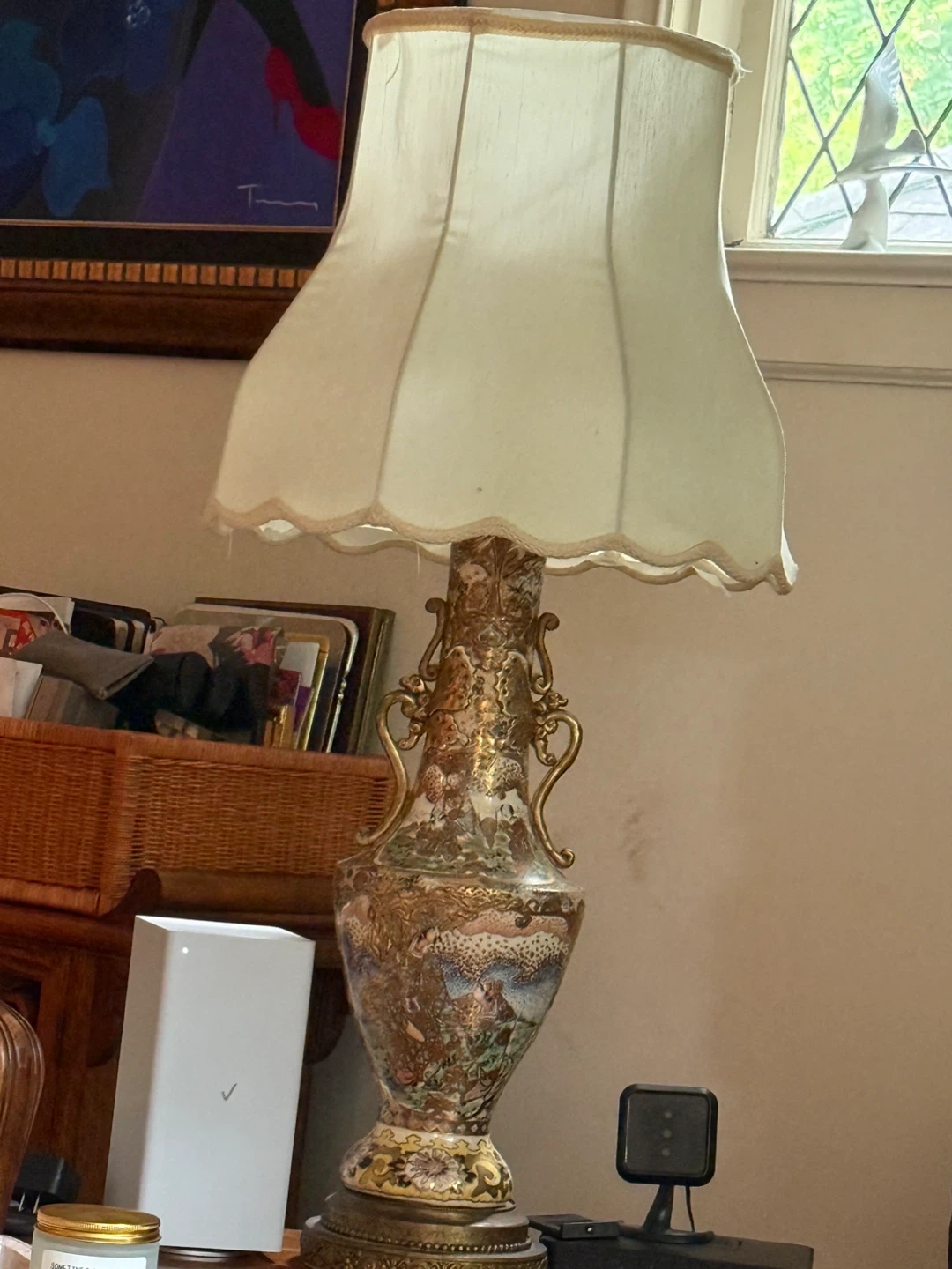 73Selling a beautiful vintage table lamp. It features a unique floral vase design with gold accents and a pleated lampshade. The lamp has an ornate, classic look that would add a touch of elegance to any room