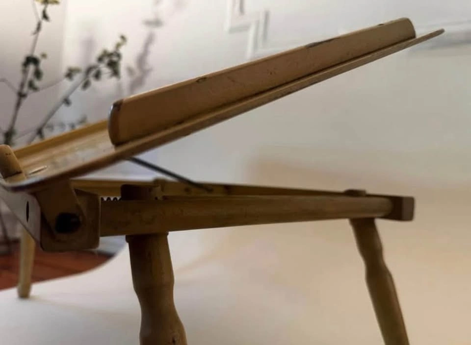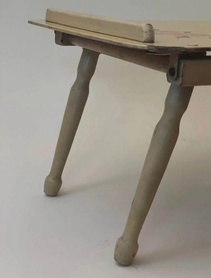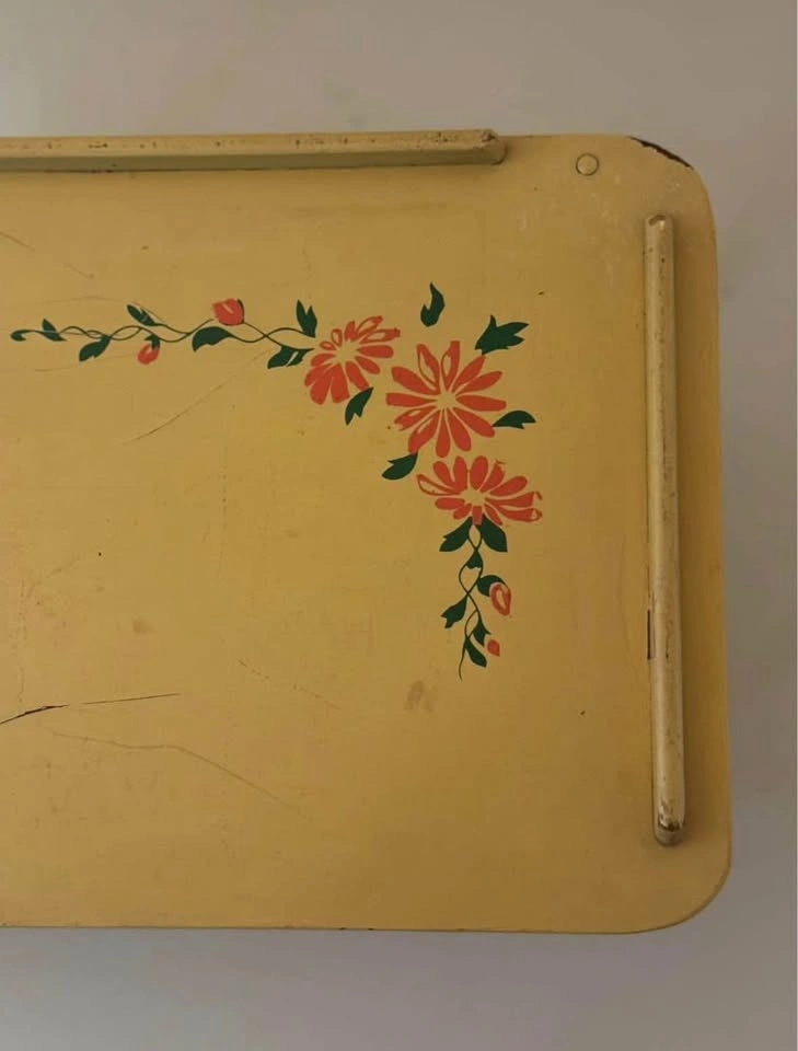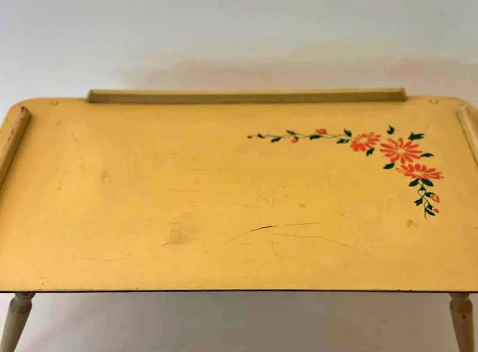 75Charming vintage folding bed tray from the 1950s, featuring a yellow/cream surface with a hand-painted floral design. Ideal as a lap desk, breakfast tray, or decorative piece. • Sturdy folding wooden legs • Adjustable incline surface • Authentic vintage wear adds character (see photos) Size: 22” wide x 12” deep x 8.5” high Condition: Pre-owned, shows signs of age and use, but still functional and beautiful for display or light use. Pickup in Bed-Stuy, Brooklyn Asking $10 or best offer (OBO)