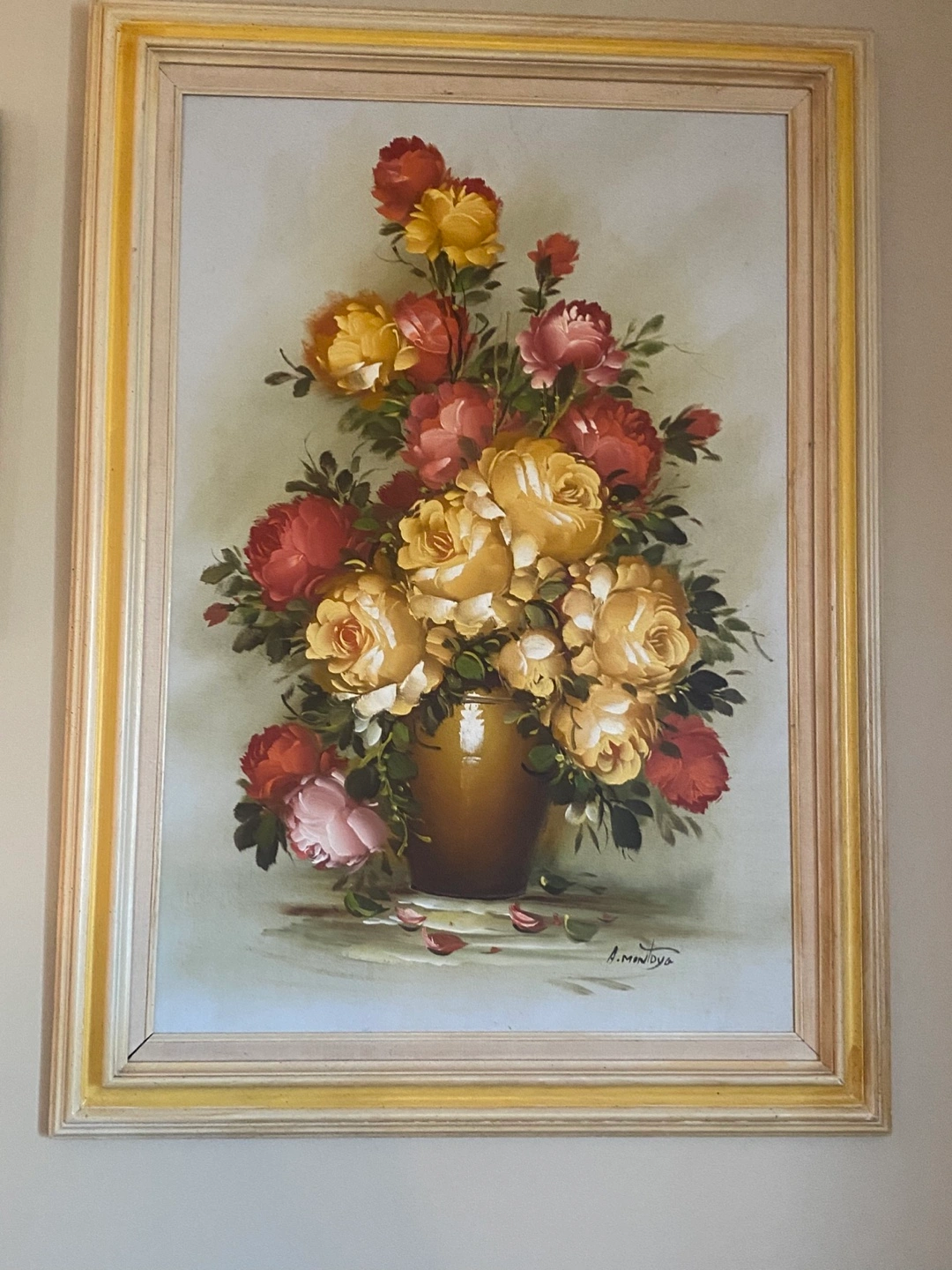 Beautiful oil painting of roses in a vase. Framed in a light beige frame with gold inner trim. Artist signature present.