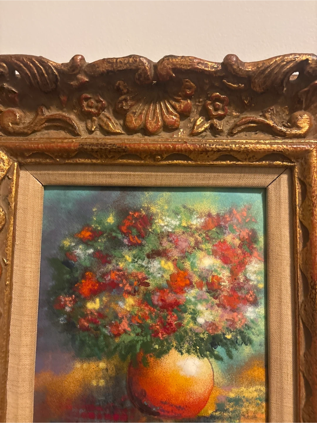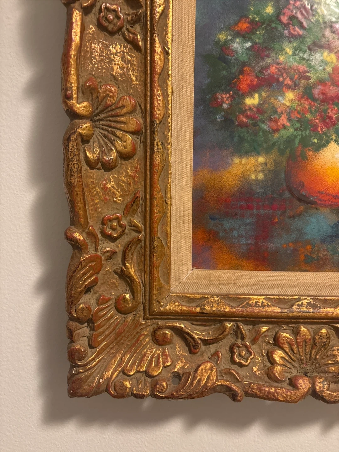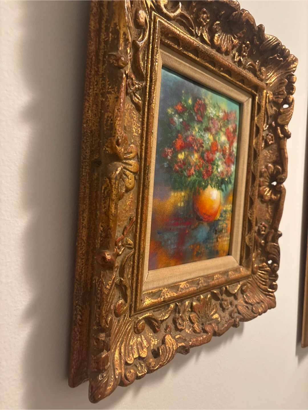 A framed painting of a floral arrangement. The frame is ornate and gold in color. The painting features red, white, and yellow flowers in a vase.