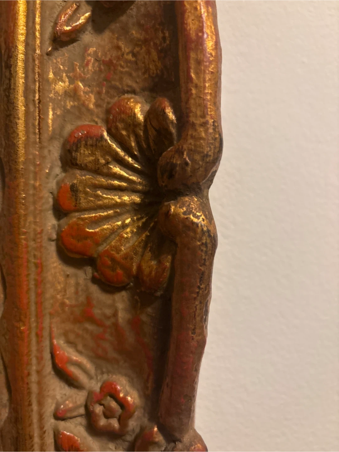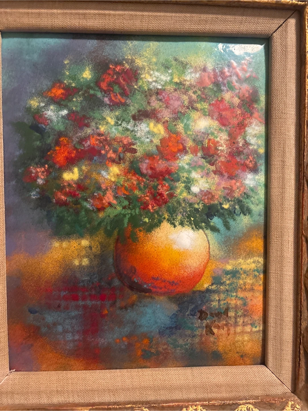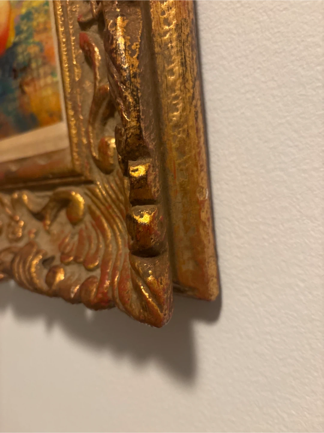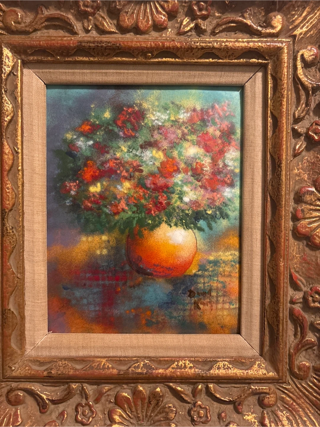 A framed painting of a floral arrangement. The frame is ornate and gold in color. The painting features red, white, and yellow flowers in a vase.