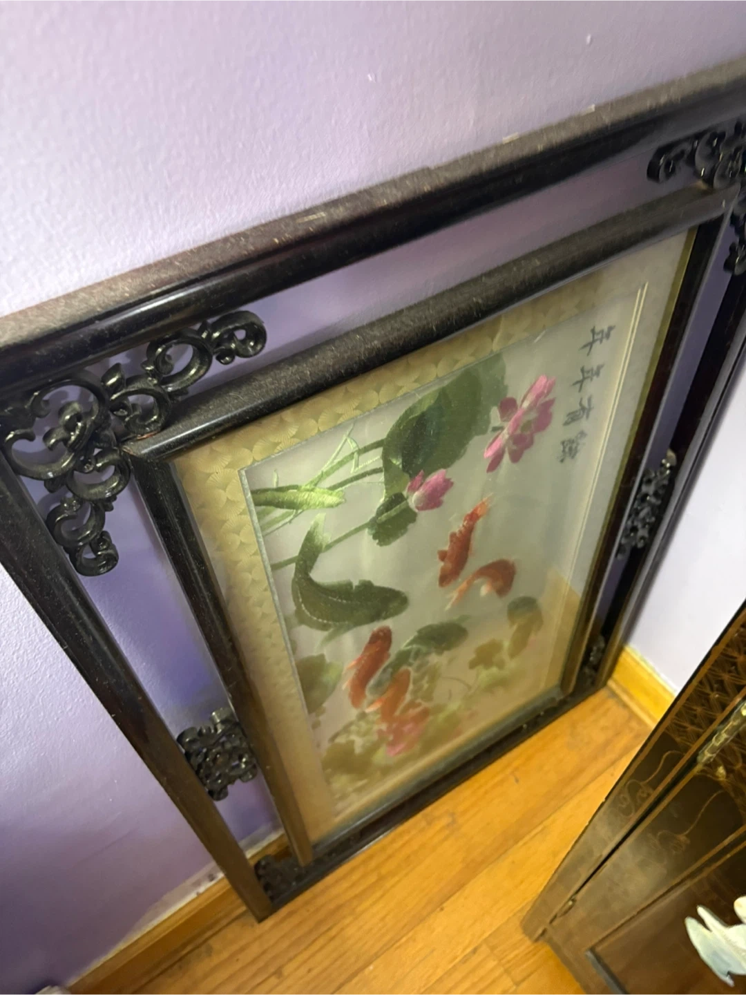 Selling a beautiful vintage framed silk embroidery piece! The artwork features lotus flowers and koi fish in vibrant colors. The frame has intricate detailing, adding to its unique charm. It's a lovely piece to add a touch of elegance to any room