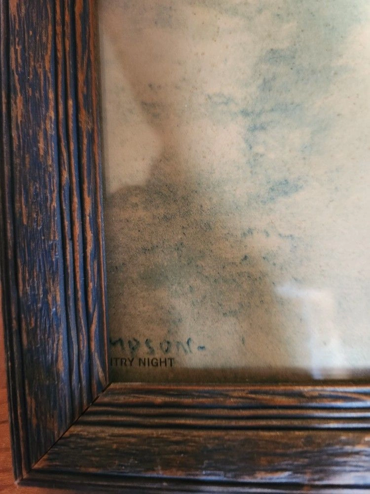 Vintage Framed Wintry Night Lithograph. Lower left corner says Wintry Night and has the artist signature. Part of the signature is cutoff by the frame. All I can read is "MPSON -" so it may be W M. Thompson? This seems similar to other work of his. 21.75" long x 15.75" wide. Frame has glass over the print. Print has a blue / yellow tone to it. Comes from non-smoking household. Originality: Original. Medium: Lithograph