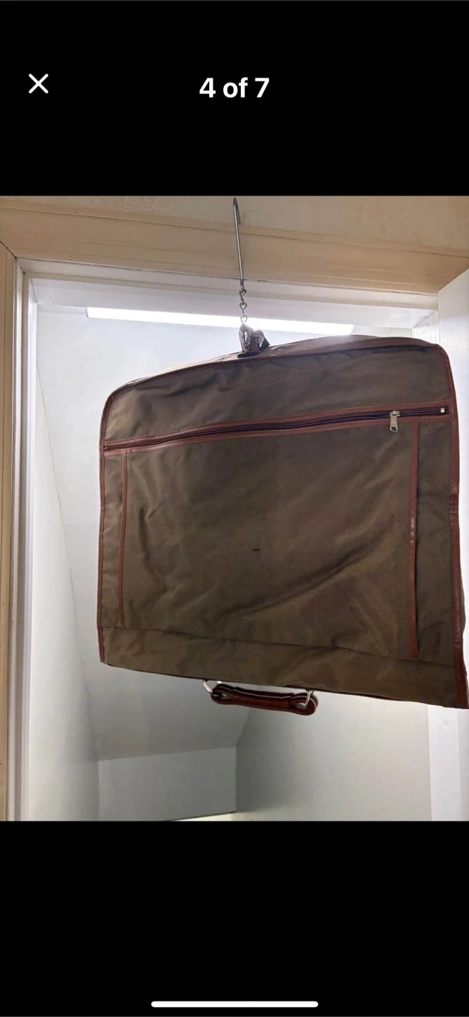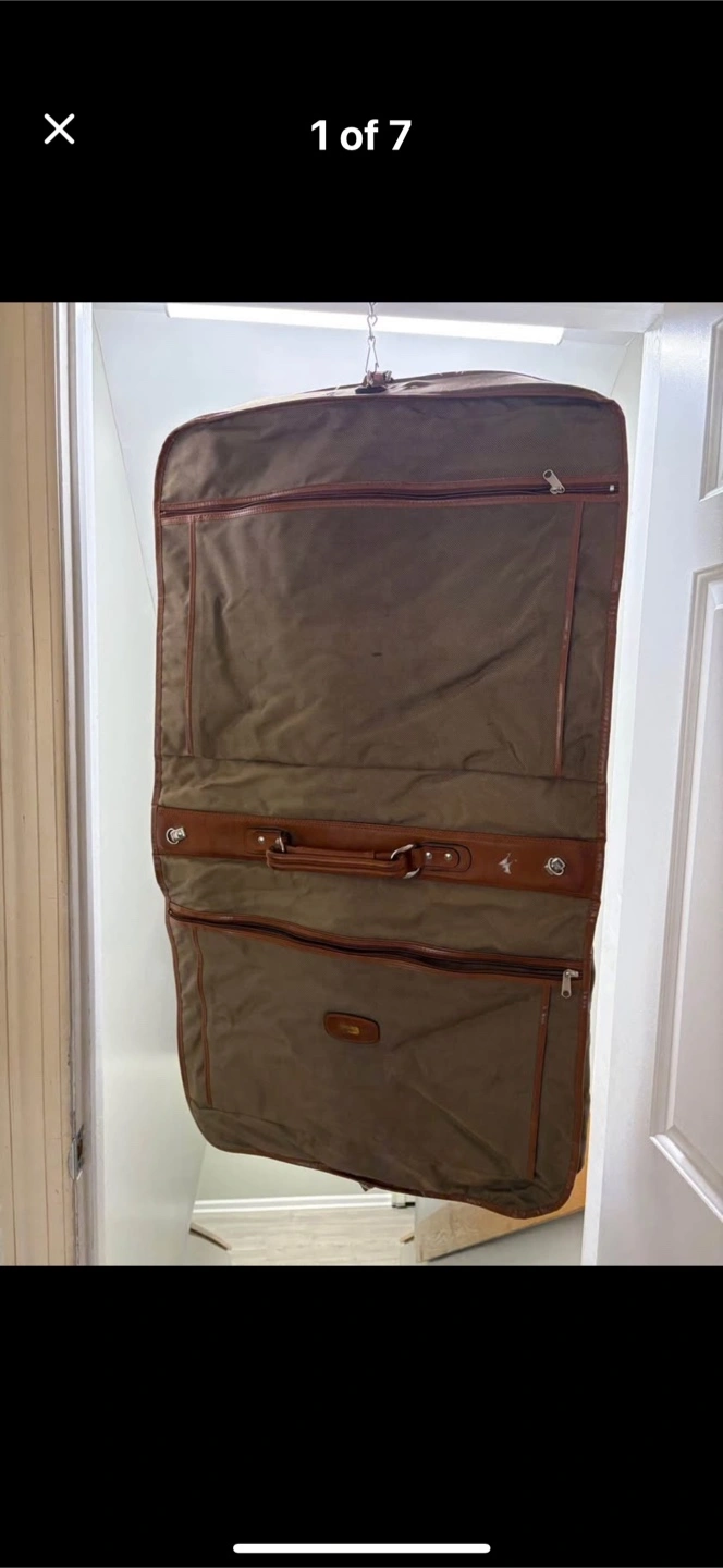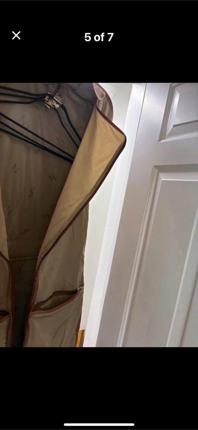 65Beige canvas garment bag. Brown leather trim. Two zippered compartments. Interior pockets. Hanging hook (fit 5). Classic style. All zippers works. No shoulder strap.