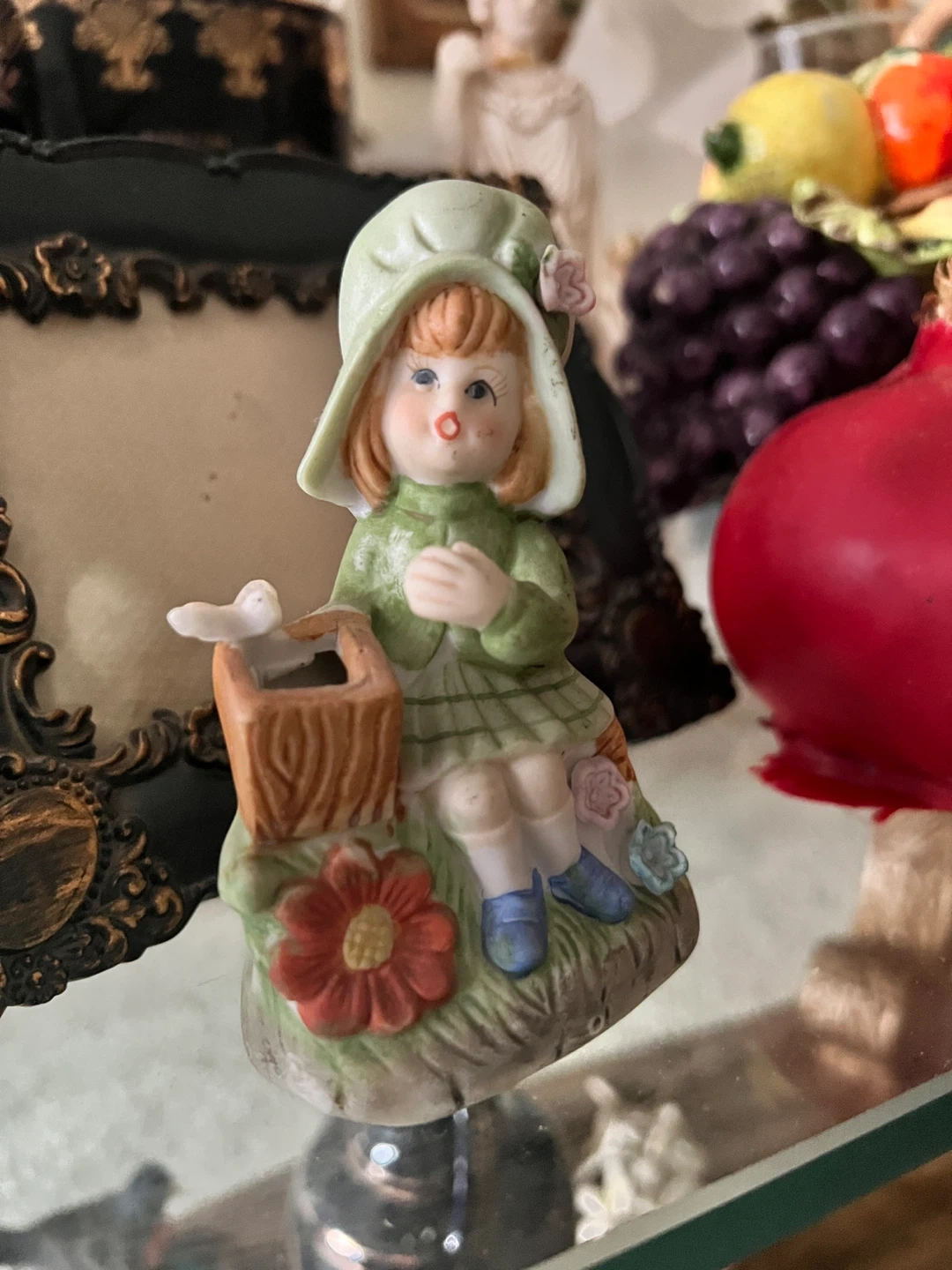 110This is an adorable vintage figurine of a girl with a bonnet and a basket! It's in great condition and would look lovely on a shelf or desk
