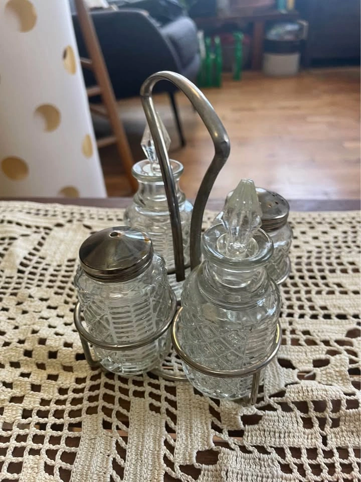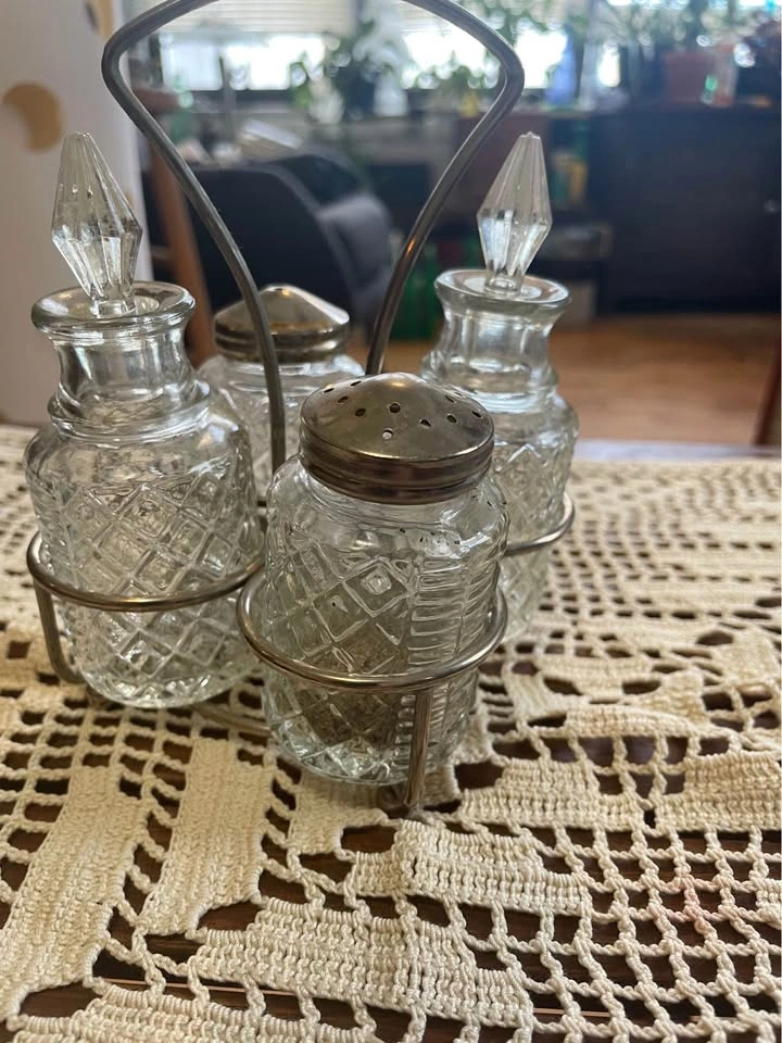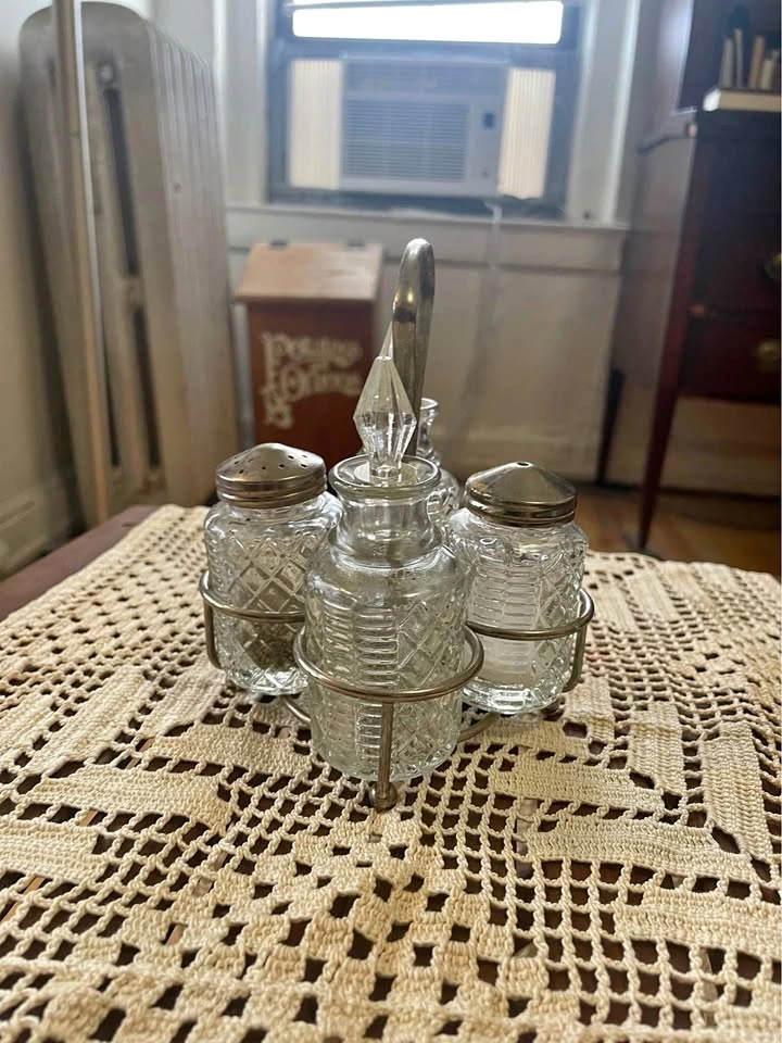 4 glass bottles for salt, pepper, oil, vinegar or whatever you choose in a pretty metal holder. Cash only pick up in Astoria