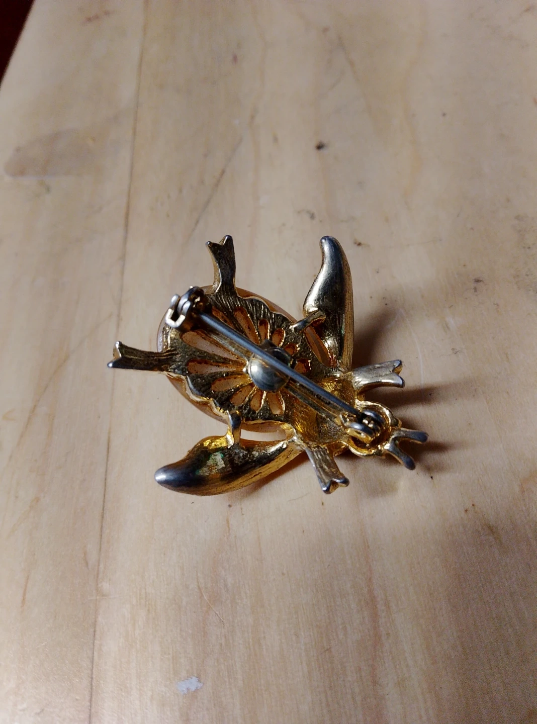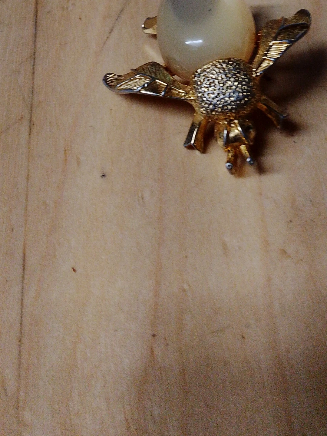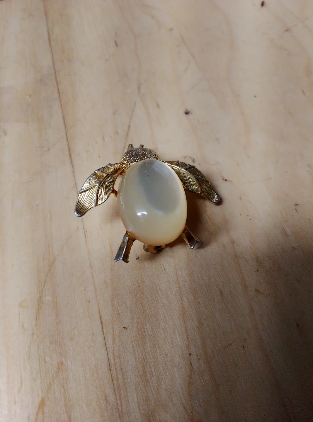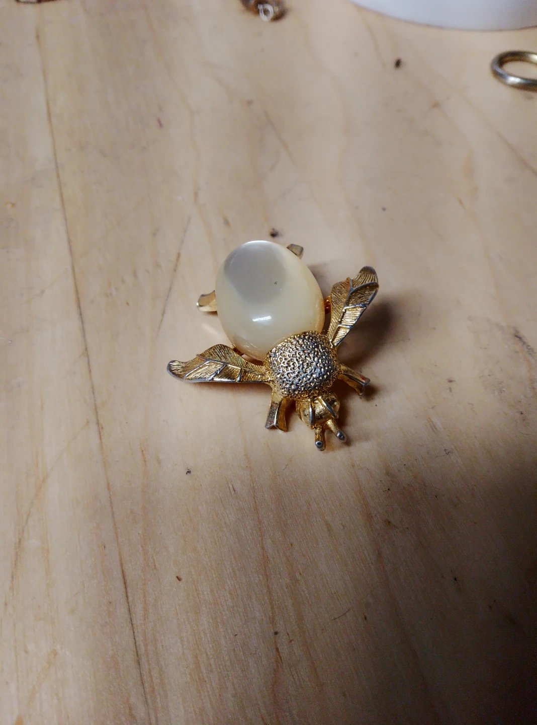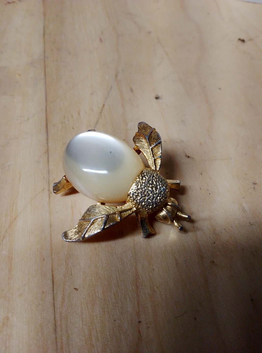92Vintage gold tone bee brooch with a faux pearl body and textured wings. The pin is in good condition and ready to add a touch of whimsy to your outfit!