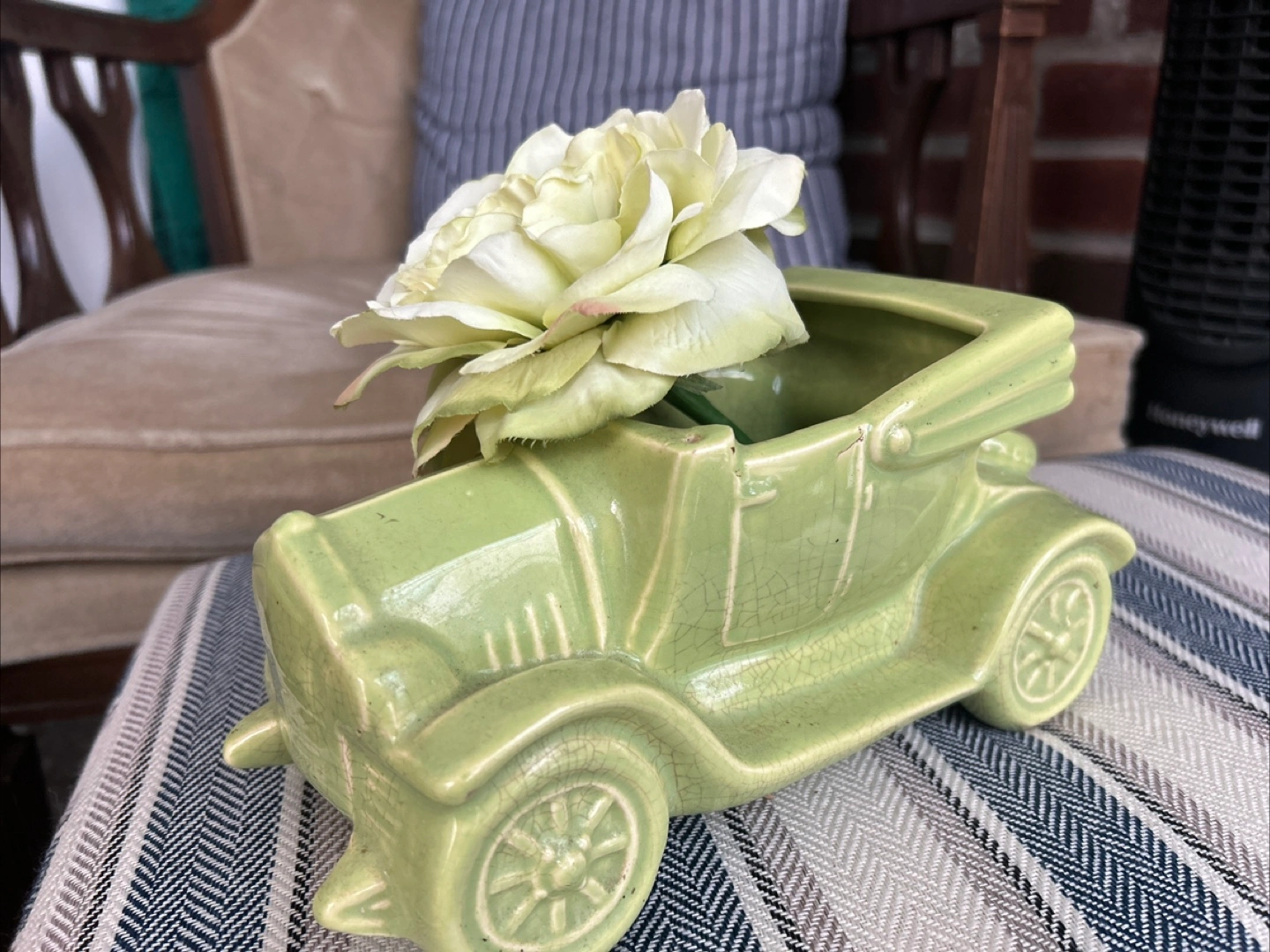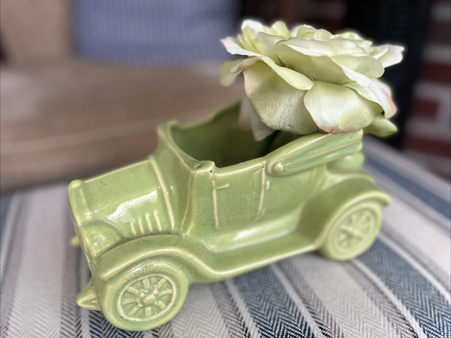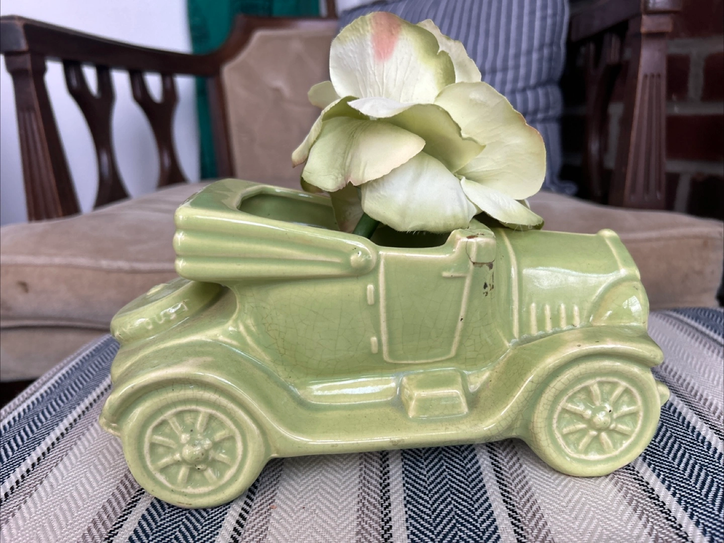 Selling a cute vintage ceramic planter shaped like an old-timey car! It's a lovely light green color and in great condition. Perfect for adding a touch of whimsy to your home or garden.