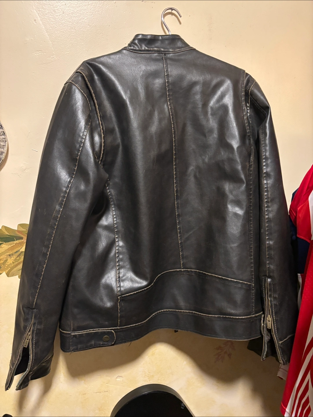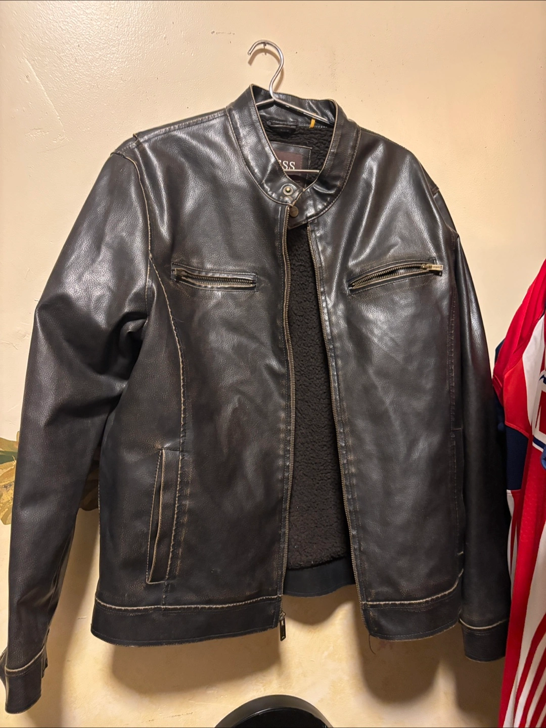 Selling a vintage Guess black faux leather jacket. It features a stylish design with zipper details and a comfortable lining. Great for adding a touch of edgy style to any outfit!