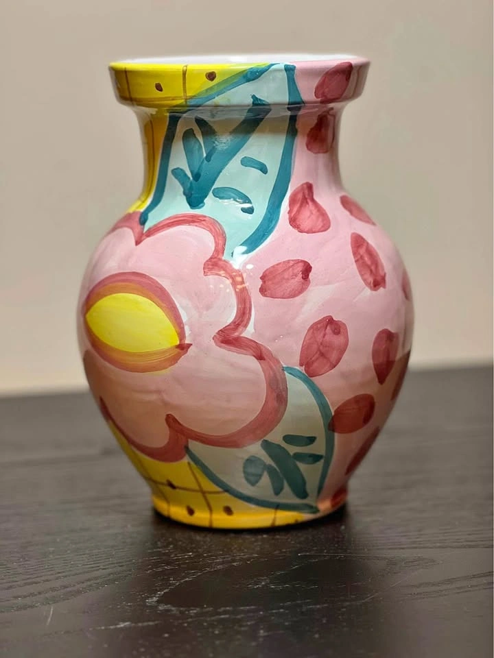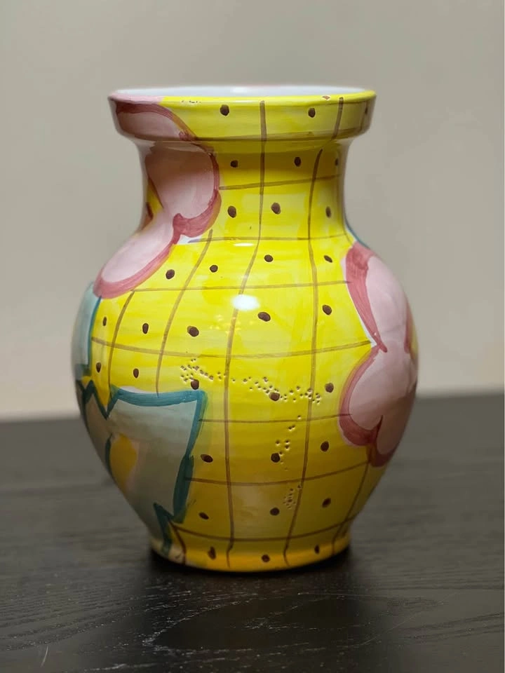 117This is a hand-painted ceramic vase. The style is consistent with a piece by Elizabeth Barrett Roache for Present Tense, made in Italy. It is a vintage item, with some similar pieces dating back to 1991. Design: The vase features a bright, abstract pattern with bold colors like yellow, pink, and teal, including a large floral or eye-like motif on a yellow grid pattern. This playful use of geometric and organic shapes and vibrant, contrasting colors is characteristic of the Postmodern or Memphis design movement. Material: It is made of ceramic and has a glazed or "wet look" finish.