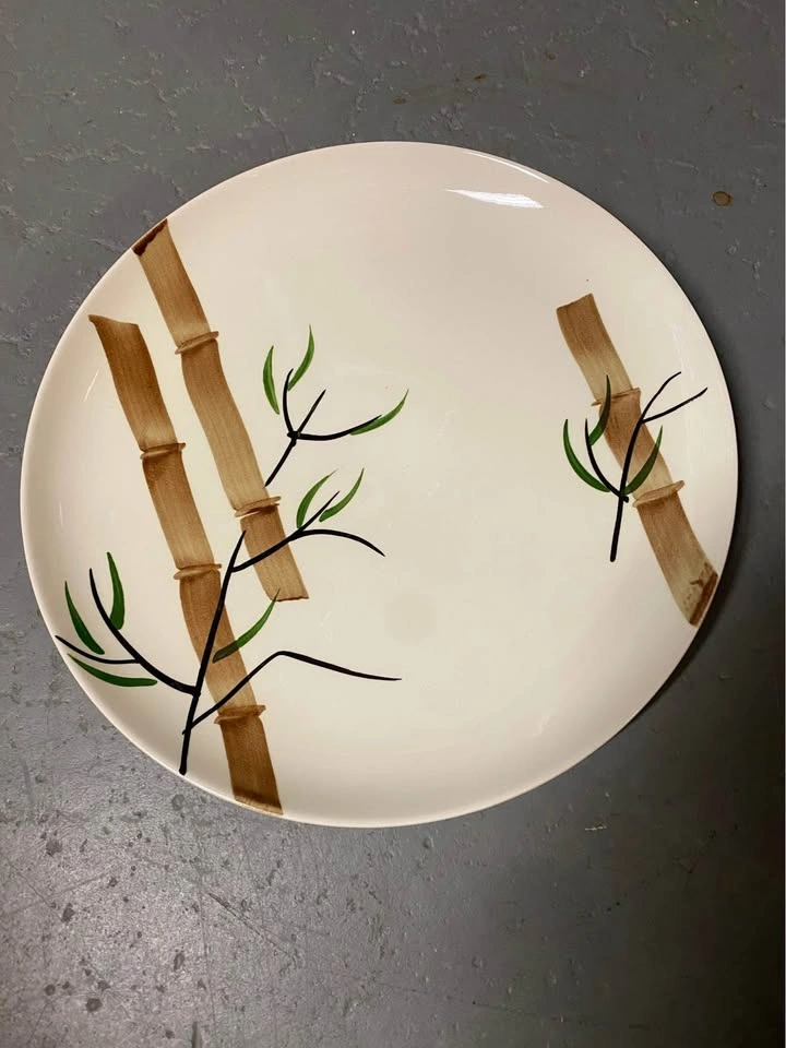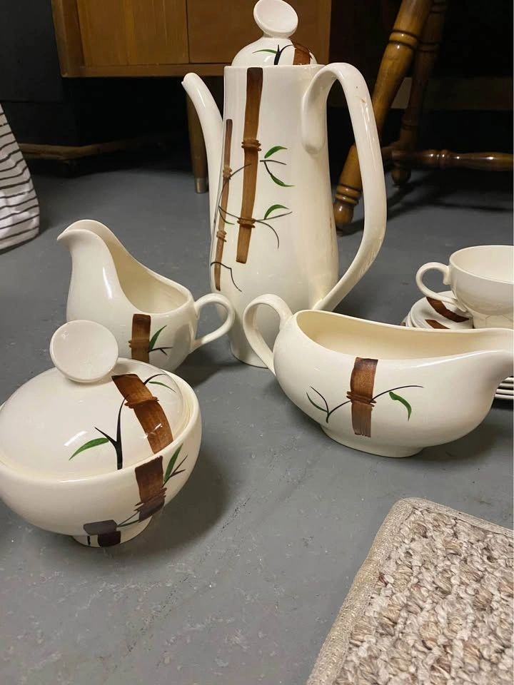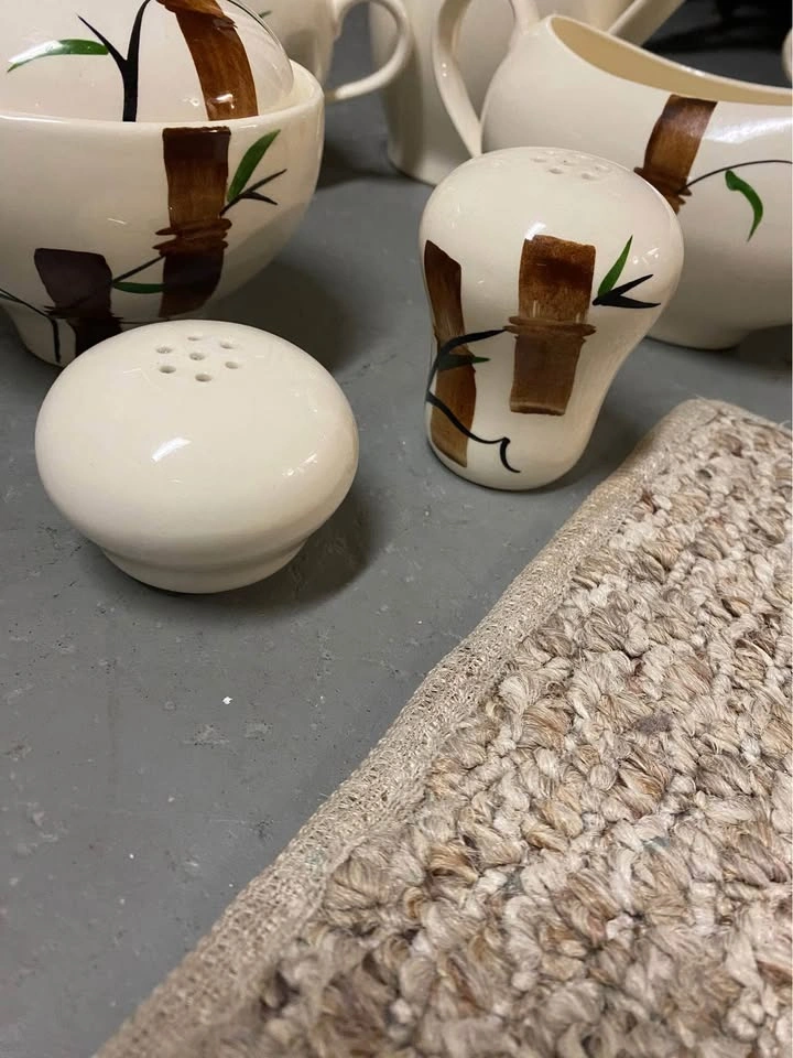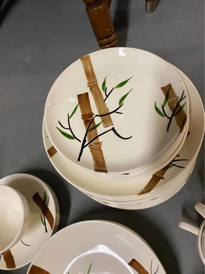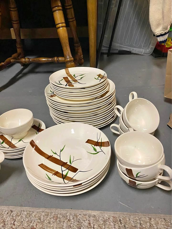7 cups and saucers, 5 bowls, 7 small plates, 14 large plates, salt and pepper shakers (missing plugs), sugar bowl, gravy bowl, creamer and pitcher.