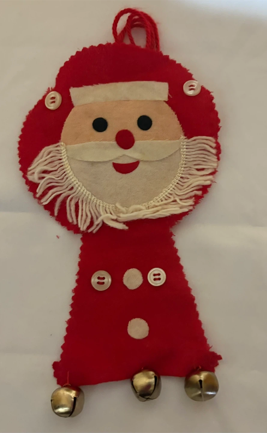 15Here's a vintage Handmade Santa Christmas Ornament! . It's made of red felt with white accents and has little bells at the bottom. It would be a cute addition to your holiday decor